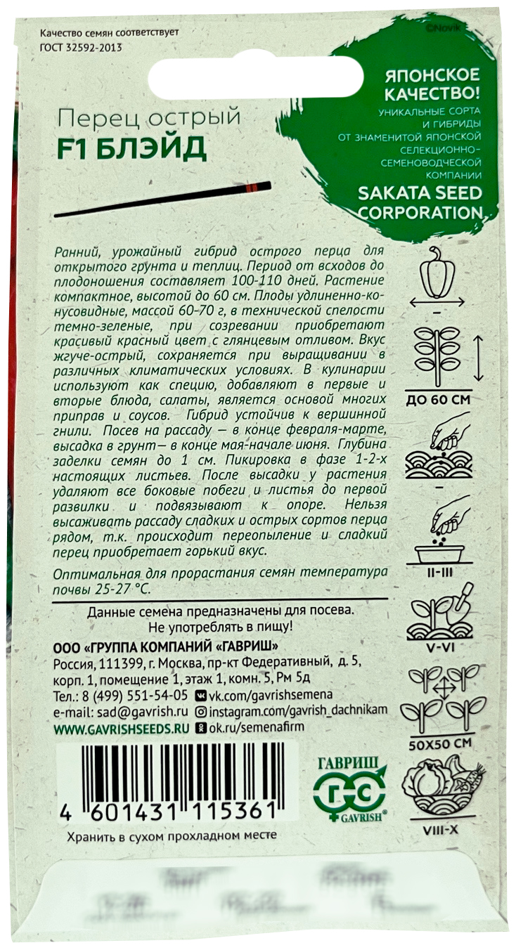 Перец острый Блэйд F1Ранний, урожайный гибрид острого перца для открытого грунта и теплиц. Период от всходов до плодоношения составляет 100-110 дней. Растение компактное, высотой до 60 см. Плоды удлиненно-конусовидные, массой 60-70 г, в технической спелости темно-зеленые, при созревании приобретают красивый красный цвет с глянцевым отливом. Вкус жгуче-острый, сохраняется при выращивании в различных климатических условиях. В кулинарии используют как специю, добавляют в первые и вторые блюда, салаты, является основой многих приправ и соусов. Гибрид устойчив к вершинной гнили. Посев на рассаду — в конце февраля-марте, высадка в грунт— в конце мая-начале июня. Пикировка в фазе 1-2-х настоящих листьев. После высадки у растения удаляют все боковые побеги и листья до первой развилки и подвязывают к опоре. Нельзя высаживать рассаду сладких и острых сортов перца рядом, т.к. происходит переопыление и сладкий перец приобретает горький вкус.