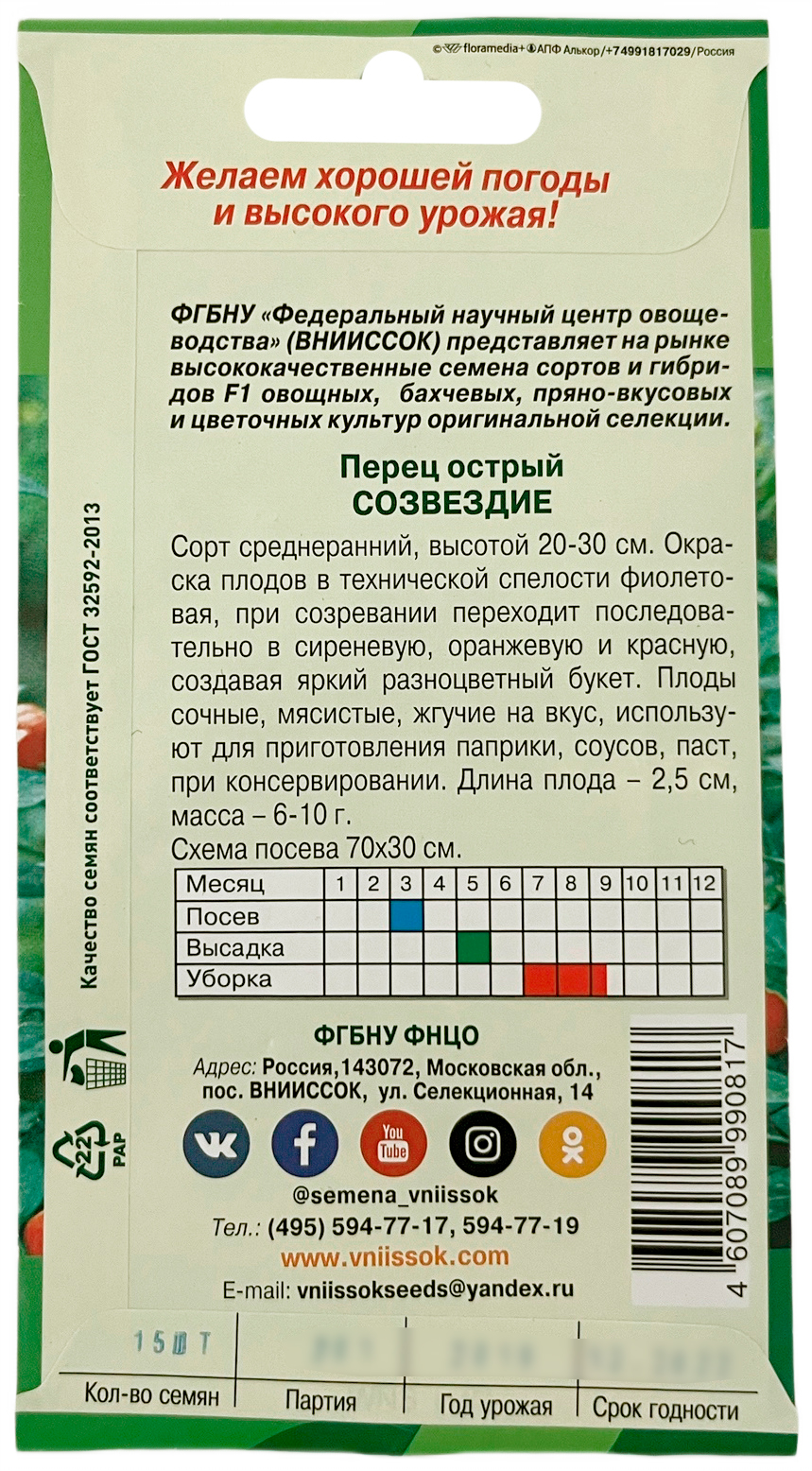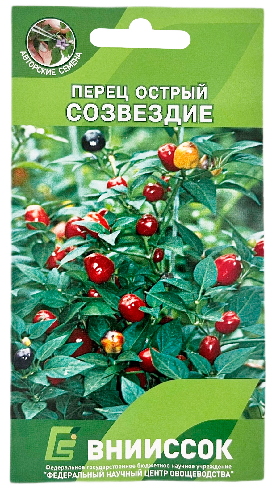 Перец острый Созвездие ВНИИССОКСреднеранний сорт с растянутым периодом созревания плодов. Растение низкорослое, компактное, ветвистое, высотой 20-30 см. Плоды сердцевидные, вверх торчащие, одиночные, сочные, гладкие. Длина плода 2,0-2,5 см, диаметр — 2,0 см. Средняя масса плода 6-10 г.