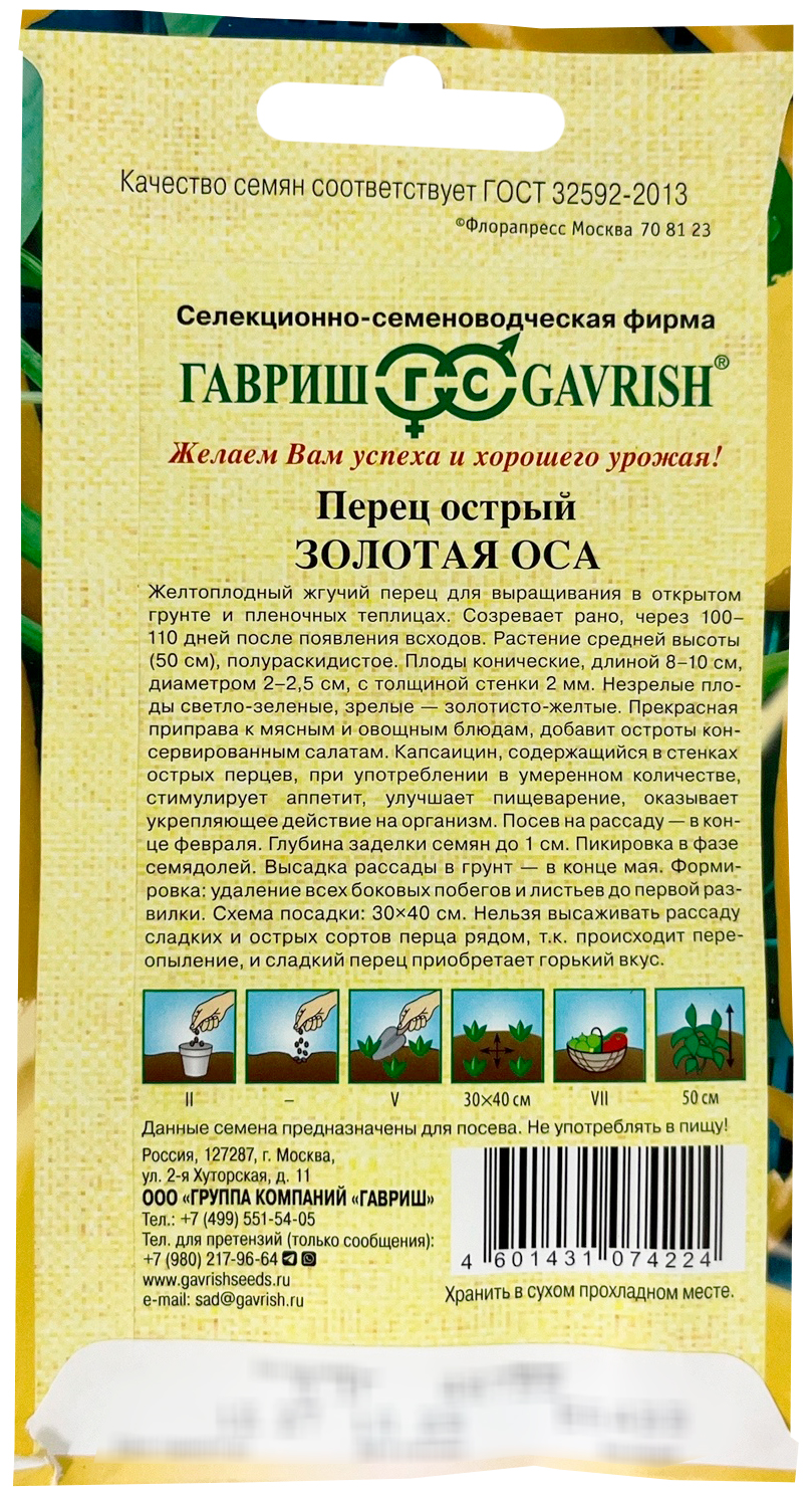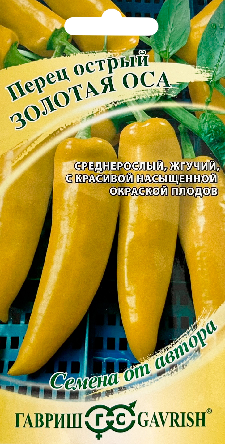 Перец острый Золотая оса (Capsicum annuum)Желтоплодный жгучий перец для выращивания в открытом грунте и пленочных теплицах. Созревает рано, через 100-110 дней после появления всходов. Растение высокое, компактное. Плоды конические, длиной 8-10 см, диаметром 2-2,5 см, с толщиной стенки 2 мм. Незрелые плоды светло-зеленые, зрелые - золотисто-желтые. Прекрасная приправа к мясным и овощным блюдам, добавит остроты консервированным салатам. Капсицин содержащийся в стенках острых перцев, при употреблении в умеренном количестве, стимулирует аппетит, улучшает пищеварением, оказывает укрепляющее действие на организм. Посев на рассаду - в конце февраля. Пикировка в фазе семядолей. Высадка рассады в грунт в конце мая. Формировка: удаление всех боковых побегов и листьев до первой развилки. Схема посадки: 30x40 см.