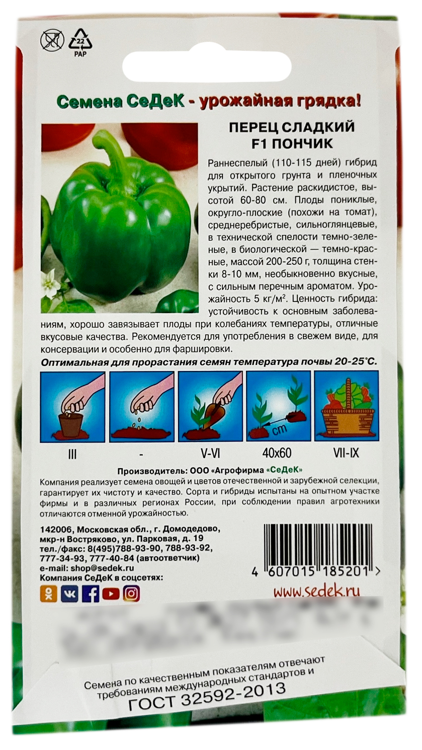 Перец сладкий F1 ПОНЧИК СеДеКРаннеспелый (110-115 дней) гибрид для открытого грунта и пленочных укрытий. Растение раскидистое, высотой 60-80 см. Плоды пониклые, округло-плоские (похожи на томат), среднеребристые, сильноглянцевые, в технической спелости темно-зеленые, в биологической – темно-красные, массой 200-250 г, толщина стенки 8-10 мм, необыкновенно вкусные, с сильным перечным ароматом. Урожайность 5 кг/м2. Ценность гибрида: устойчивость к основным заболеваниям, хорошо завязывает плоды при колебаниях температуры, отличные вкусовые качества. Рекомендуется для употребления в свежем виде, для консервации и особенно для фаршировки.