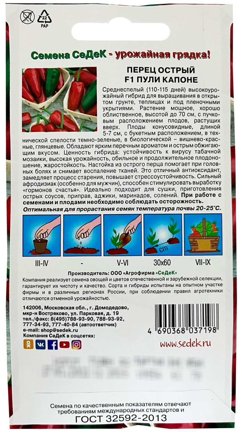 Перец острый Пули Капоне F1 СеДеКСреднеспелый (110-115 дней) высокоурожайный гибрид для выращивания в открытом грунте, в теплицах и под пленочными укрытиями. Растение мощное, хорошо облиственное, высотой до 70 см, с пучковым расположением плодов, растущих вверх. Плоды конусовидные, длиной 5-7 см, с букетным расположением, в технической спелости темно-зеленые, в биологической – вишнево-красные, глянцевые. Обладают ярким перечным ароматом и острым обжигающим вкусом. Ценность гибрида: устойчивость к вирусу табачной мозаики, высокая урожайность, обильное и продолжительное плодоношение, жаростойкость. Настойка из острого перца помогает при головных болях и снимает воспаление тканей. Это отличный антиоксидант, замедляет процесс старения, повышает стрессоустойчивость. Сильный афродизиак (особенно для мужчин), способен стимулировать выработку «гормонов счастья». Идеально подходит для сушки, приготовления острых соусов, приправ, аджики, маринадов, солений.