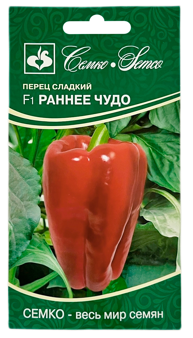 Перец сладкий РАННЕЕ ЧУДО СЕМКОГибрид раннеспелый. От всходов до технической спелости 90- 95 дней, до биологической 110-115 дней. Растение мощное, компактное, индетерминантное. Плоды призмовидной формы, глянцевые, длиной 14-16 см, в диаметре 8-10 см, в технической спелости зелёные, в биологической – тёмно-красные, плотные, массой 240-260 г, толщина стенки 9-10 мм. Гибрид легко адаптируется к различным условиям выращивания, стрессоустойчив, хорошо переносит высокие температуры. Вкус отличный, товарность высокая. Устойчив к вирусу табачной мозаики. Рекомендуется для теплиц и открытого грунта. Схема высадки 70х50 см. Урожайность 12-13 кг/м2.