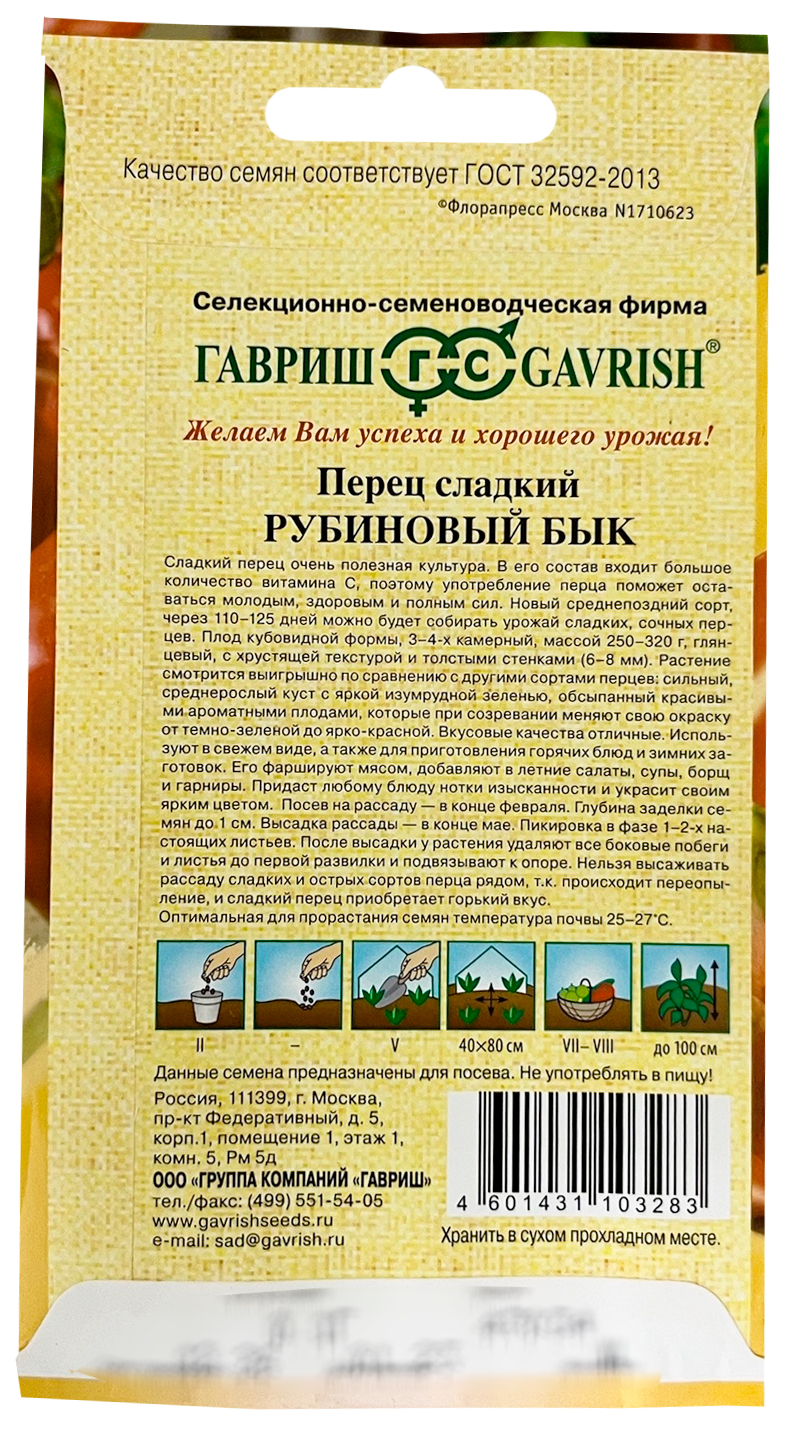 Перец сладкий Рубиновый быкСладкий перец очень полезная культура. В его состав входит большое количество витамина С, поэтому употребление перца поможет оставаться молодым, здоровым и полным сил. Новый среднепоздний сорт, через 110-125 дней можно будет собирать урожай сладких, сочных перцев. Плод кубовидной формы, 3-4-х камерный, массой 250-320 г, глянцевый, с хрустящей текстурой и толстыми стенками (6-8 мм). Растение смотрится выигрышно по сравнению с другими сортами перцев: сильный, среднерослый куст с яркой изумрудной зеленью, обсыпанный красивыми ароматными плодами, которые при созревании меняют свою окраску от темно-зеленой до ярко-красной. Вкусовые качества отличные. Используют в свежем виде, а также для приготовления горячих блюд и зимних заготовок. Его фаршируют мясом, добавляют в летние салаты, супы, борщ и гарниры. Придаст любому блюду нотки изысканности и украсит своим ярким цветом. Посев на рассаду — в конце февраля. Глубина заделки семян до 1 см. Высадка рассады — в конце мае. Пикировка в фазе 1-2-х настоящих листьев. После высадки у растения удаляют все боковые побеги и листья до первой развилки и подвязывают к опоре. Нельзя высаживать рассаду сладких и острых сортов перца рядом, т.к. происходит переопыление и сладкий перец приобретает горький вкус.
