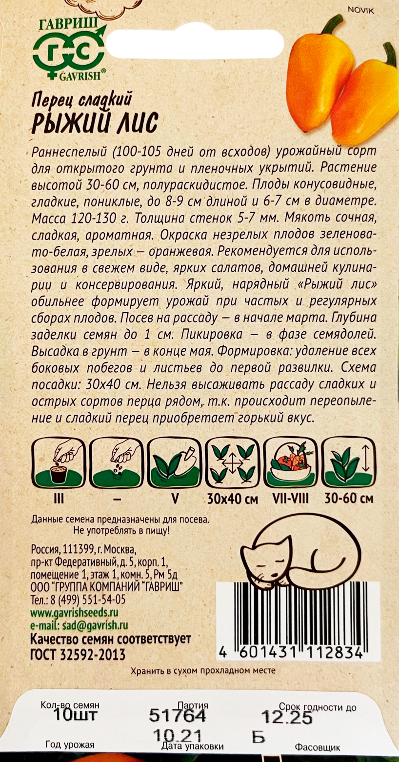 Перец Рыжий лис 10 шт. серия Ленивый огород Н21Раннеспелый (100-105 дней от всходов) урожайный сорт для открытого грунта и пленочных укрытий. Растение высотой 30-60 см, полураскидистое. Плоды конусовидные, гладкие, пониклые, до 8-9 см длиной и 6-7 см в диаметре. Масса 120-130 г. Толщина стенок 5-7 мм. Мякоть сочная, сладкая, ароматная. Окраска незрелых плодов зеленовато-белая, зрелых — оранжевая. Рекомендуется для использования в свежем виде, ярких салатов, домашней кулинарии и консервирования. Яркий, нарядный «Рыжий лис» обильнее формирует урожай при частых и регулярных сборах плодов. Посев на рассаду — в начале марта. Глубина заделки семян до 1 см. Пикировка — в фазе семядолей. Высадка в грунт — в конце мая. Формировка: удаление всех боковых побегов и листьев до первой развилки. Схема посадки: 30х40 см. Нельзя, высаживать рассаду сладких и острых сортов перца рядом, т.к. происходит переопыление и сладкий перец приобретает горький вкус.