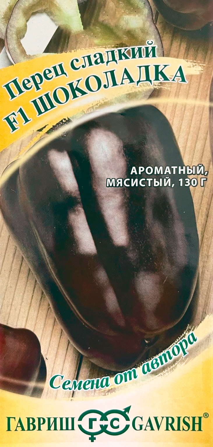 Перец сладкий ШОКОЛАДКА F1 ГАВРИШСреднеранний (115-130 дней от всходов до начала плодоношения), среднерослый (до 80 см), компактный гибрид. Плоды усеченно-цилиндрической формы, массой 120-130 г, толщина стенок 4-7 мм. Окраска плодов в технической спелости темно-зеленая, в биологической —шоколадная. Рекомендуется для выращивания в пленочных теплицах и как горшечная культура. Посев на рассаду в начале марта. Пикировка в фазе семядолей. Высадка рассады в грунт в конце мая. Формировка: удаление всех боковых побегов и листьев до первой развилки. Предназначен для маринования, приготовления салатов и лечо. Схема посадки 40x60 см. Урожайность одного растения 2-2,6 кг.