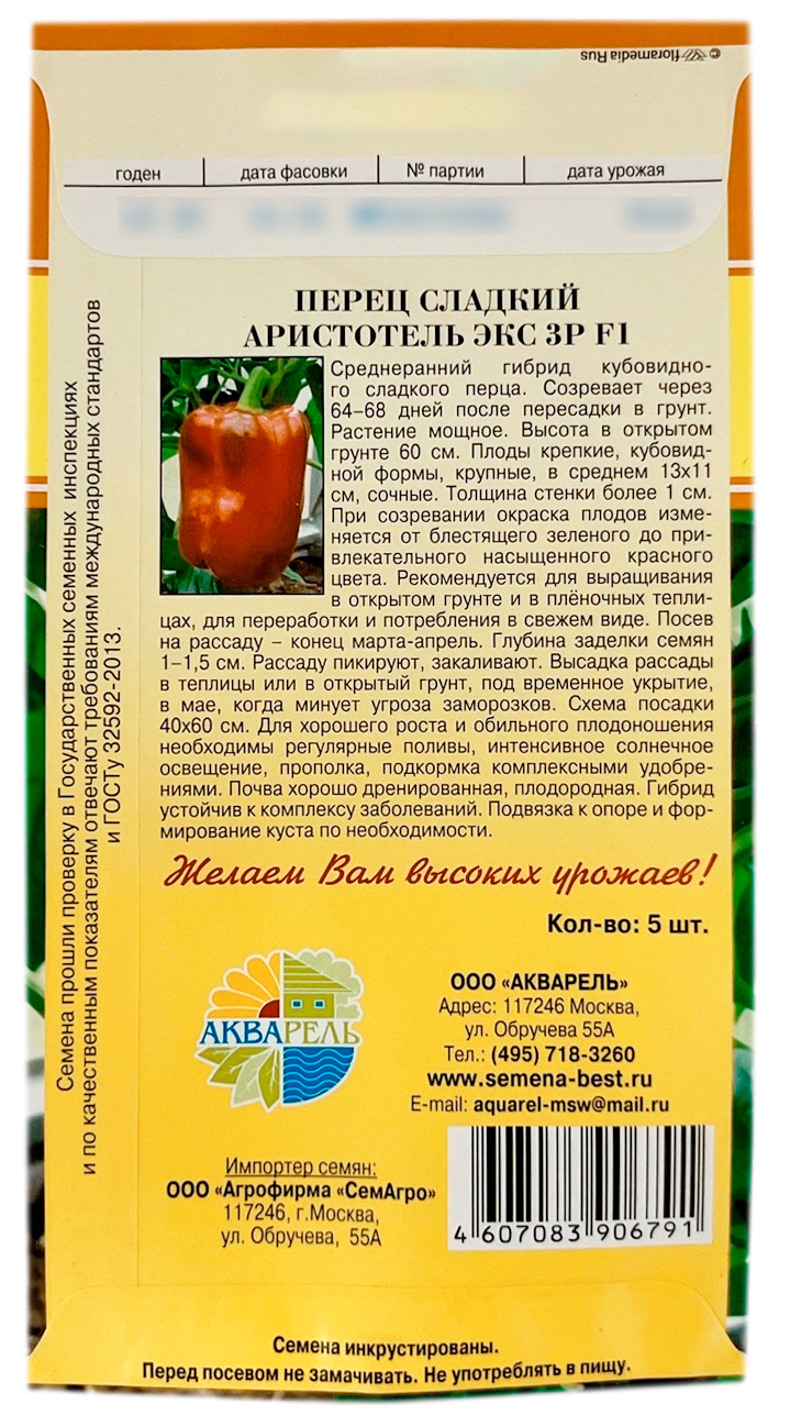 Перец сладкий АРИСТОТЕЛЬ ЭКС ЗР F1 АКВАРЕЛЬСредне - ранний гибрид кубовидного сладкого перца. Созревает через 64-68 дней после пересадки в грунт. Растение мощное. Высота в открытом грунте 60 см. Плоды крепкие, кубовидной формы, крупные, в среднем 13х11 см, сочные. Толщина стенки более 1 см. При созревании окраска плодов изменяется от блестящего зеленого до привлекательного насыщенного красного цвета. Отличается толерантность к растрескиванию, хорошей лёжкостью и транспортабельностью. Универсальный гибрид, рекомендуется для выращивания в открытом грунте и в плёночных теплицах, для переработки и потребления в свежем виде. Устойчивость к болезням Tobamo (Tobamo virus strains P0) - вирус табачной мозаики. BS 1-3 (Bacterial spot) - бактериальная пятнистость. PVY (Potato Virus Y strein P0) - Y-вирус картофеля.