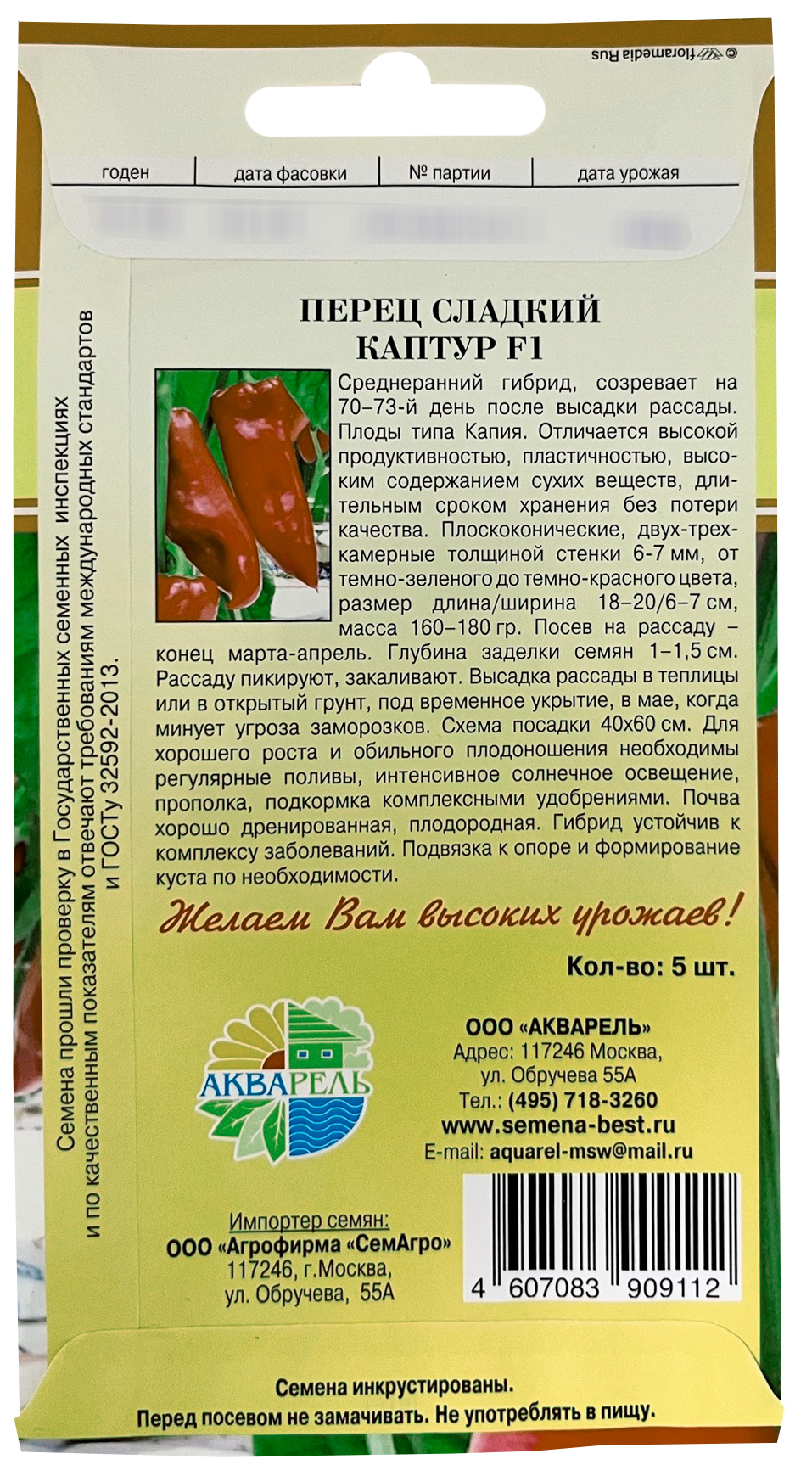 Перец сладкий Каптур F1 АКВАРЕЛЬСреднеранний гибрид, созревает на 70-73-й день после высадки рассады. Плоды типа Капия. Отличается высокой продуктивностью, пластичностью, высоким содержанием сухих веществ, длительным сроком хранения без потери качества. Плоскоконические, двух-трехкамерные толщиной стенки 6-7мм, от темно-зеленого до темно-красного цвета, размер длина/ширина 18-20/6-7см, масса 160-180 гр. Посев на рассаду – конец марта - апрель. Глубина заделки семян 1-1,5 см. Рассаду пикируют, закаливают. Высадка рассады в теплицы или в открытый грунт, под временное укрытие, в мае, когда минует угроза заморозков. Схема посадки 40х60 см. Для хорошего роста и обильного плодоношения необходимы регулярные поливы, интенсивное солнечное освещение, прополка, подкормка комплексными удобрениями. Почва хорошо дренированная, плодородная. Гибрид устойчив к комплексу заболеваний. Подвязка к опоре и формирование куста по необходимости. Высокое содержание сухих веществ. Очень хорош для запекания на гриле. Длительный срок хранения плодов без потери качества. Предназначен для выращивания в открытом грунте.