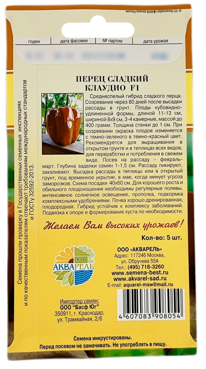 Перец сладкий КЛАУДИО F1 АКВАРЕЛЬСреднеспелый гибрид сладкого перца. Созревание через 80 дней после высадки рассады в грунт. Плоды кубовидно-удлиненной формы, длиной 11-13 см, шириной 8х9 см, 3-4 камерные, массой 200-250 гр. Толщина стенки до 1 см. При созревании окраска плодов изменяется с темно-зеленого в темно-красный цвет. Рекомендуется для выращивания в открытом грунте и в теплицах всех видов, для переработки и потребления в свежем виде. Посев на рассаду - февраль-март. Глубина заделки семян 1-1,5 см. Рассаду пикируют, закаливают. Высадка рассады в теплицы или в открытый грунт, под временное укрытие, в мае, когда минует угроза заморозков. Схема посадки 40х60 см. Для хорошего роста и обильного плодоношения необходимы регулярные поливы, интенсивное солнечное освещение, прополка, подкормка комплексными удобрениями. Почва хорошо дренированная, плодородная. Гибрид устойчив к комплексу заболеваний. Подвязка к опоре и формирование куста по необходимости.