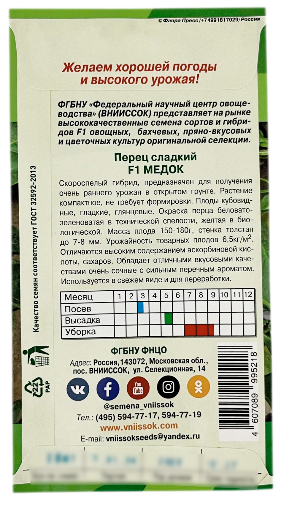 Перец сладкий МЕДОК F1 ВНИИССОКСкороспелый гибрид, предназначен для получения очень раннего урожая в открытом грунте. Растение компактное, не требует формировки. Плоды кубовидные, гладкие, глянцевые. Окраска перца беловатозеленоватая в технической спелости, желтая в биологической. Масса плода 150-180г, стенка толстая до 7-8 мм. Урожайность товарных плодов 6,5кг/м2. Отличаются высоким содержанием аскорбиновой кислоты, сахаров. Обладает отличными вкусовыми качествами очень сочные с сильным перечным ароматом. Используется в свежем виде и для переработки.