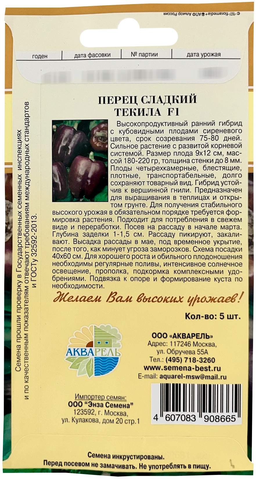 Перец сладкий Текила F1 АКВАРЕЛЬВысокопродуктивный ранний гибрид с кубовидными плодами сиреневого цвета, срок созревания 75-80 дней. Сильное растение с развитой корневой системой. Размер плода 9х12 см, массой 180-220 гр, толщина стенки до 8 мм. Гидрид устойчив к вершинной гнили. Предназначен для выращивания в теплицах и открытом грунте.