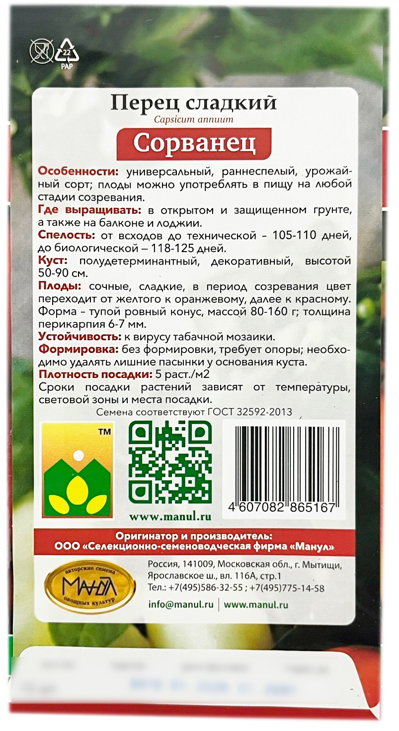 Перец сладкий СОРВАНЕЦ МАНУЛУниверсальный, раннеспелый, урожайный сорт; плоды можно употреблять в пищу на любой стадии созревания. От всходов до технической 105-110 дней, до биологической 118-125 дней. Полудетерминантный, среднерослый, декоративный, высотой 50-90 см. Сочные, сладкие, в период созревания цвет переходит от желтого к оранжевому, далее к красному. Форма – тупой ровный конус, массой 80-160 г; толщина перикарпия 6-7 мм.