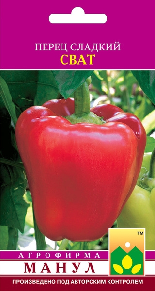 Сват — урожайный, раннеспелый сорт; от всходов до технической спелости 118-120 дней, до биологической — 150-156 дней. Куст полудетерминантный, среднерослый, полураскидистый, рыхлый, высотой 80-110 см. Листья светлоокрашенные. Плоды тяжелые, красивой кубической формы, 3-4-камерные, пониклые, на короткой плодоножке, вдавленной в основание плода, массой 250-330 г, размером 9-12×8-10 см; толщина перикарпия 7-8 мм. В технической спелости плоды зеленовато-желтоватые, в биологической — красные. Отличается интенсивным плодообразованием, высокой нагрузкой плодов на растении (33-37 шт.!), эффектными светлоокрашенными плодами высоких вкусовых качеств. Устойчив к вирусу табачной мозаики. Предназначен для выращивания под пленочными укрытиями и в весенних необогреваемых и обогреваемых теплицах. Плотность посадки 3-5 раст./м2. Растения формируют в 2-3 побега с подвязкой.Характеристики