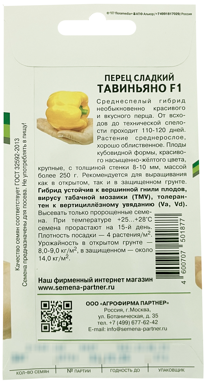 Перец Тавиньяно F1Среднеспелый гибрид необыкновенно красивого и вкусного перца. От всходов до технической спелости проходит 110-120 дней. Растение среднерослое, хорошо облиственное. Плоды кубовидной формы, красивого насыщенно-жёлтого цвета, крупные, с толщиной стенки 8-10 мм, массой более 250 г. Рекомендуется для выращивания как в открытом, так и в защищенном грунте. Гибрид устойчив к вершинной гнили плодов, вирусу табачной мозаики (TMV), толерантен к вертициллёзному увяданию (Va, Vd). Высевать только пророщенные семена. При температуре +25…+28°C семена прорастают на 15-й день.