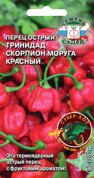 Тринидад Скорпион красный был выведен в Южной Америке в государстве Тринидад. В марте 2012 года сорт «Trinidad Scorpion Moruga» занесён в книгу рекордов Гиннесса как самый острый перец в мире. По шкале Сковилла его жгучесть варьируется от 1,2 до 2 млн. единиц.Среднепоздний (110-120 дней) сорт для теплиц и пленочных укрытий. Растение прямостоячее, высотой 60-80 см. Плоды округлые, слегка ребристые, морщинистые, длиной 4-5 см, массой 15-16 г, в технической спелости ярко-зеленые, в биологической красные блестящие. Имеют фруктовый аромат. Жгучесть перцу придает капсаицин, который применяется в медицине в качестве обезболивающего и разогревающего средства.