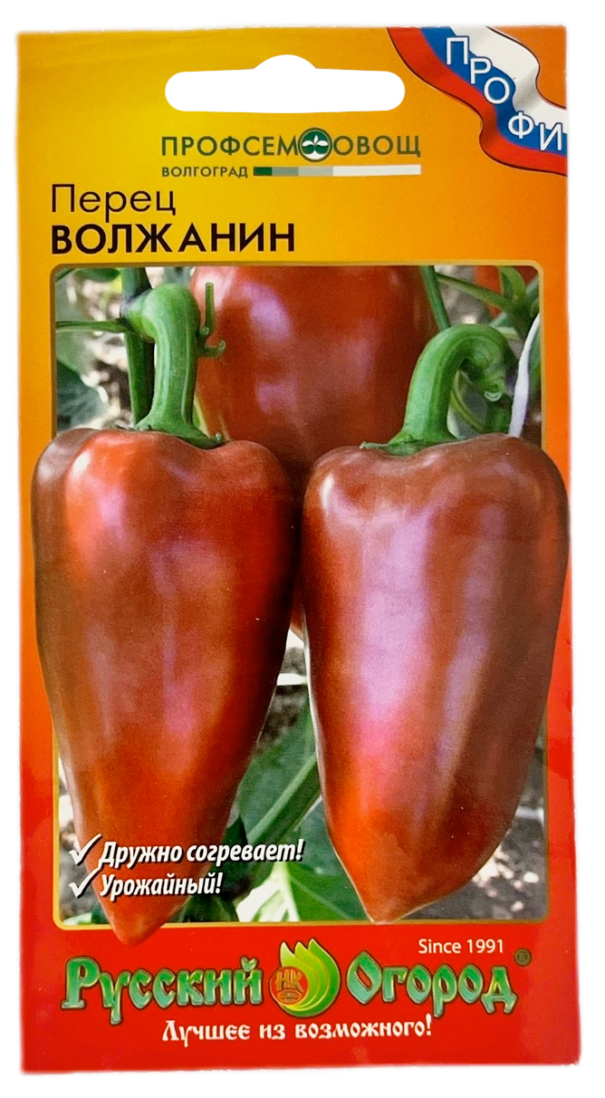 Перец сладкий ВОЛЖАНИН Русский ОгородУрожайный среднеспелый сорт для выращивания в открытом грунте! Созревание плодов (техническая спелость) наступает на 112-120 день после полных всходов. Высота полуштамбового и полураскидистого растения всего 45 см. При этом урожайность стабильная, до 7 кг/м.кв. Плоды широко-конусовидные, длиной до 11 см, массой 44-77 г, повислые. Созревают дружно. Вкусовые качества свежих плодов отличные, со средним ароматом. Использование - универсальное. Сорт устойчив к вртициллезу.