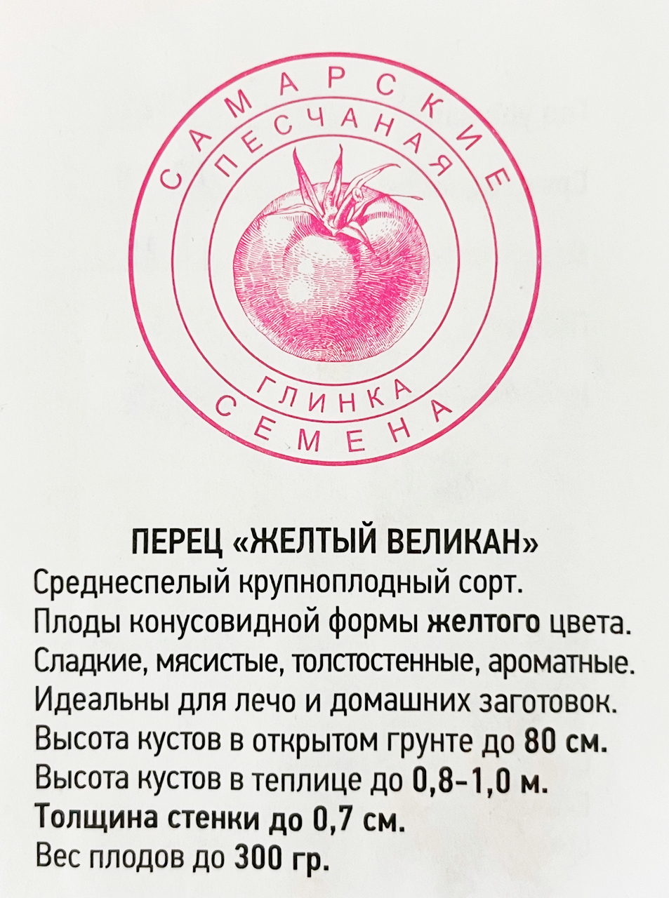 Перец Жёлтый ВеликанСреднеспелый сортовой сорт - "Желтый Великан" для выращивания в открытом грунте и в теплицах. Растение, высотой до 80 см, буквально усыпано плодами - гигантами массой до 300 гр. Желтый Великан - один из самых урожайных среди сладких перцев. Толщина стенки - до 0,7 см. Прекрасен в салатах, лечо, в заморозке.