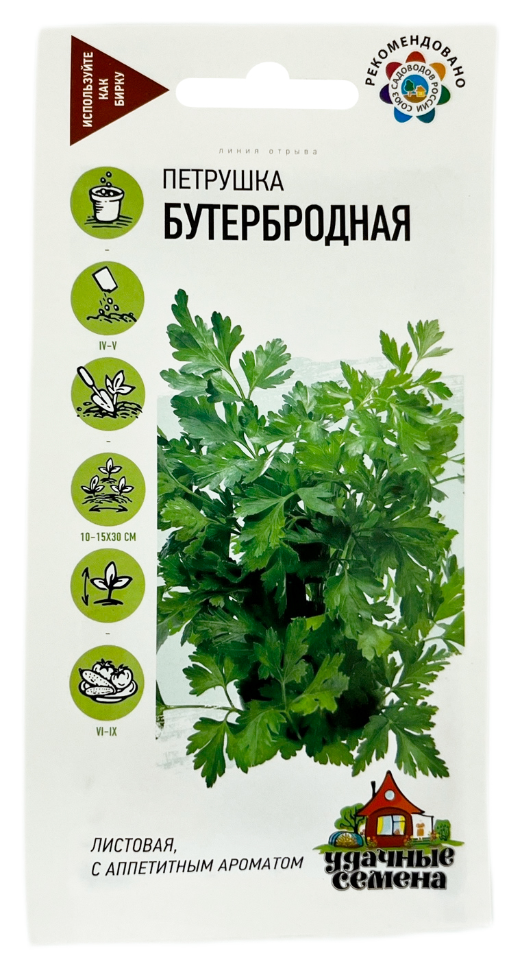 Петрушка БУТЕРБРОДНАЯ УДАЧНЫЕ СЕМЕНАСреднеспелый (65-75 дней от всходов до уборки зелени) сорт. Розетка полувертикальная, с большим количеством листьев тёмно-зелёного цвета. Листья сильнорассеченные, гладкие, очень ароматные. Масса зелени с одного растения 60-100 г. Хорошо отрастает после срезки. Корневища перезимовывают в почве и быстро дают свежую зелень ранней весной. Рекомендуется для употребления в свежем, сушеном и консервированном виде. Уборку листьев производят периодически, по мере необходимости. Перед посевом семена необходимо замочить в течение суток в теплой воде. Урожайность 2,8-4,8 кг/м2.