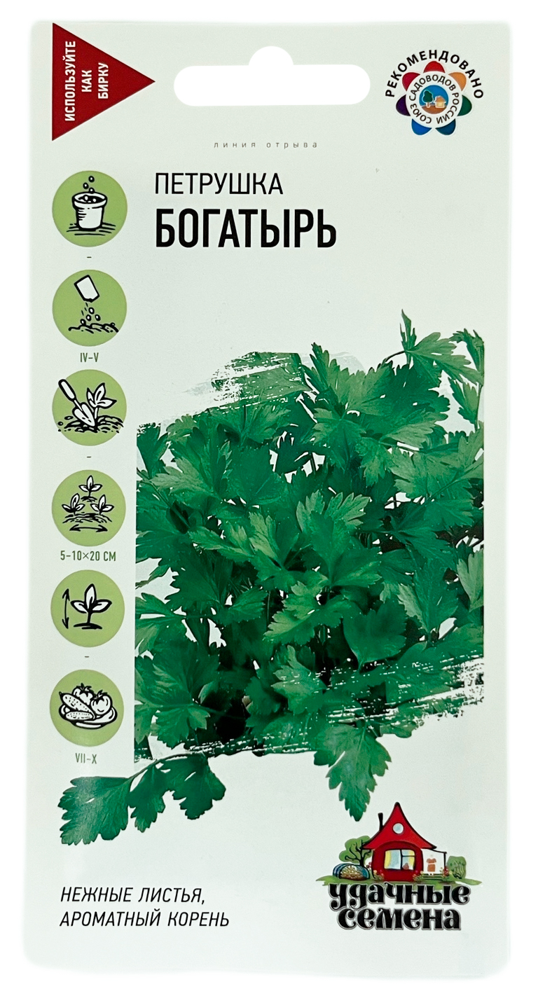 Петрушка БОГАТЫРЬ УДАЧНЫЕ СЕМЕНАПозднеспелый сорт, предназначенная для использования зеленых листьев, черешков и корнеплодов. Посев в грунт производится в конце апреля – начале мая на глубину 1 см. Розетка листьев полуприподнятая. Лист крупный, темно-зеленый, треугольной формы. Зелень хорошо отрастает после срезки, прекрасно подходит для выгонки зелени в зимне-весенний период, для получения раннего урожая на второй год после посева. Ароматичность высокая. Товарная урожайность 3,0 кг/м2. Теневынослив. Ценность сорта: высокая урожайность, теневыносливость, высокие темпы нарастания зелени, высокая ароматичность. Рекомендуется для использования в свежем виде.