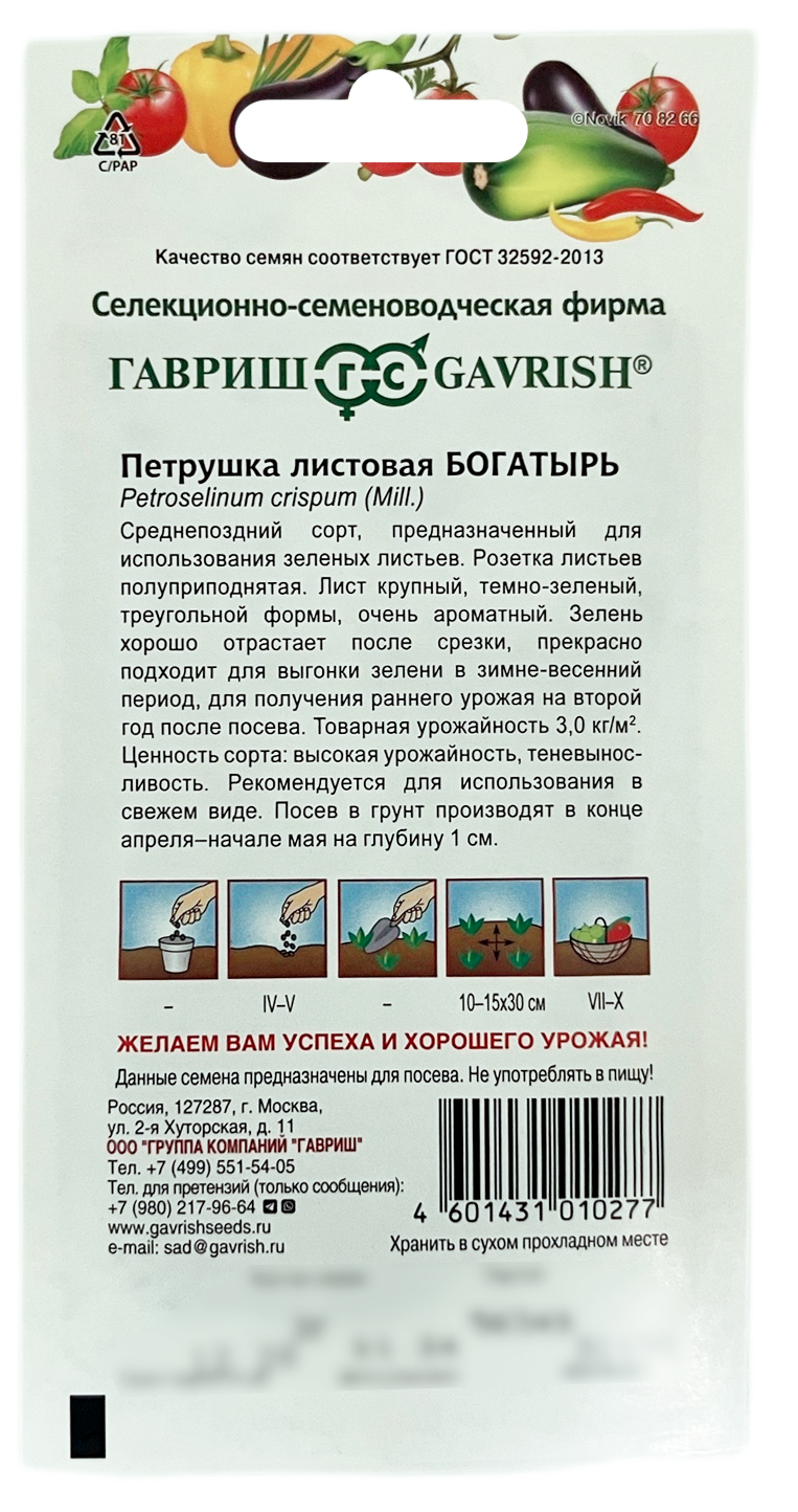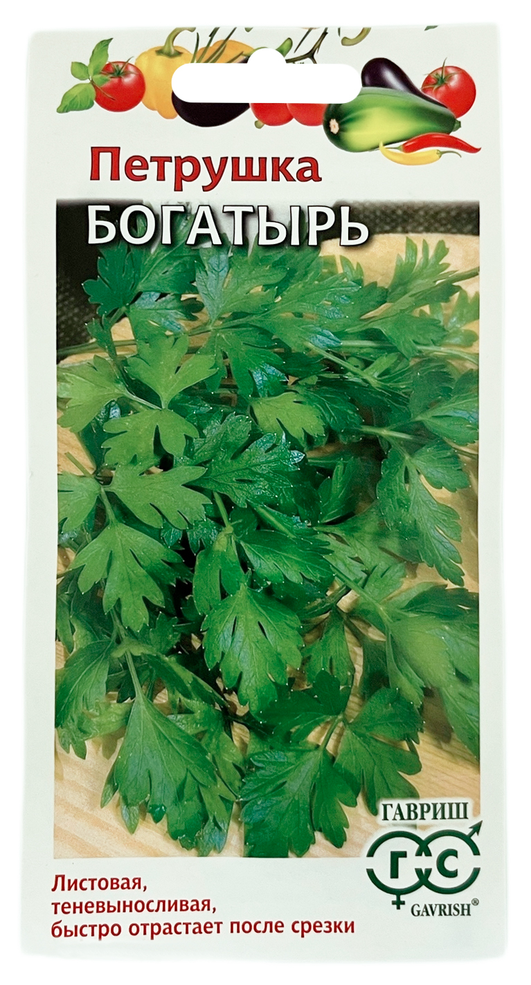 Петрушка листовая БОГАТЫРЬ ГАВРИШСреднеспелый сорт, предназначенный для использования зеленых листьев. Посев в грунт производится в конце апреля – начале мая на глубину 1 см. Розетка листьев полувертикальная, высотой около 32 см. Черешок длинный, средней толщины со слабым антоцианом. Лист крупный, темно-зеленый, треугольной формы. Зелень хорошо отрастает после срезки, прекрасно подходит для выгонки зелени в зимне-весенний период, для получения раннего урожая на второй год после посева. Ароматичность высокая. Товарная урожайность около 3,0 кг/м2. Теневынослив. Ценность сорта: высокая урожайность, теневыносливость, высокие темпы нарастания зелени, высокая ароматичность. Рекомендуется для использования в свежем и сушеном виде.