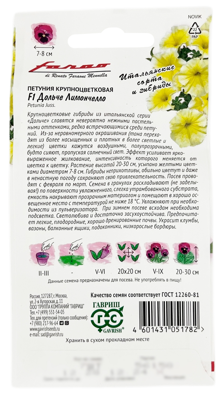 петуния крупноцветковая F1 Дольче Лимончелло ГАВРИШКрупноцветковые гибриды из итальянской серии "Дольче" славятся невероятно нежными пастельными оттенками, редко встречающимися среди петуний. Из-за неравномерного окрашивания (тона переходят из более насыщенных и плотных в более светлые и легкие) цветки кажутся воздушными, полупрозрачными, будто сияют, пропуская солнечный свет. Эффект усиливает ярко-выраженное жилкование, интенсивность которого меняется от цветка к цветку. Растение образует аккуратные кустики высотой 20-30 см, усыпанные желтыми цветками диаметром 7-8 см. Гибриды неприхотливы, обильно цветут и даже в ненастную погоду сохраняют свою привлекательность. Посев проводят поверхностно, под стекло, с февраля по март. После появления всходов стекло убирают. При зимнем посеве всходам необходима подсветка. Всходы появляются через 7-12 дней. На постоянное место высаживают, когда минует опасность заморозков. Цветет с конца мая весь сезон. Светолюбива и достаточно засухоустойчива.