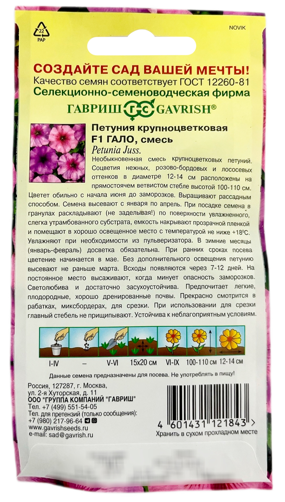 Петуния Гало F1Необыкновенная смесь крупноцветковых петуний. Соцветия нежных, розово- бордовых и лососевых оттенков в диаметре 12-14 см расположены на прямостоячем ветвистом стебле высотой 100-110 см. Цветет обильно с начала июня до заморозков. Выращивают рассадным способом. Семена высевают с января по апрель. При посадке семена в гранулах раскладывают (не заделывая!) по поверхности увлажненного, слегка утрамбованного субстрата, емкость накрывают прозрачной пленкой и помешают в хорошо освещенное место с температурой не ниже +18С. Увлажняют при необходимости из пульверизатора. В зимние месяцы (январь-февраль) досветка обязательна. При ранних сроках посева цветение начинается в мае. Без дополнительного освещения петунию высевают не раньше марта. Всходы появляются через 7-12 дней. На постоянное место высаживают, когда минует опасность заморозков. Светолюбива и достаточно засухоустойчива. Предпочитает легкие, плодородные, хорошо дренированные почвы. Прекрасно смотрится в рабатках, миксбордерах, для срезки. При использовании для срезки главный стебель не прищипывают. Устойчива к неблагоприятным условиям.