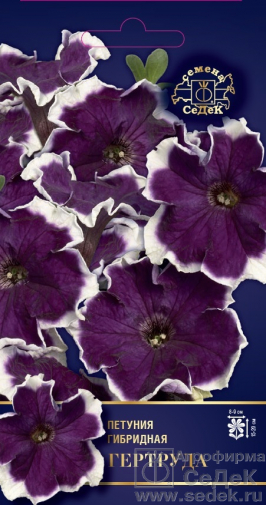 Гибрид низкорослой многоцветковой петунии серии: Калиффо, с эффектными, бахромчатыми цветками, которые полностью покрывают кустики, что не видно листьев. Растение компактное, прямостоячее, высотой 15-20 см, ширина куста 40-50 см. Цветки одиночные, воронковидные, очень крупные, диаметром 8-9 см, с бархатисто-пурпурно-фиолетовым зевом и крупной белой каймой. Петуния свето- и теплолюбива, предпочитает суглинистые и супесчаные, водопроницаемые, плодородные почвы. Не выносит сырых и кислых почв. При выращивании в контейнерах их объём должен быть 10-12 см. Необходим регулярный полив и регулярные подкормки полным минеральным удобрением, чтобы растение цвело в течение всего теплого периода и могло показать себя во всей красе. Посев семян на рассаду проводят в конце Февраля-Марте. Семена слегка вдавливают в почву, не присыпая землей, хорошо увлажняют из распылителя. При попадании влаги на гранулу оболочка должна раствориться. Посевы накрывают стеклом или целлофаном для сохранения постоянной влажности и до полных всходХарактеристики