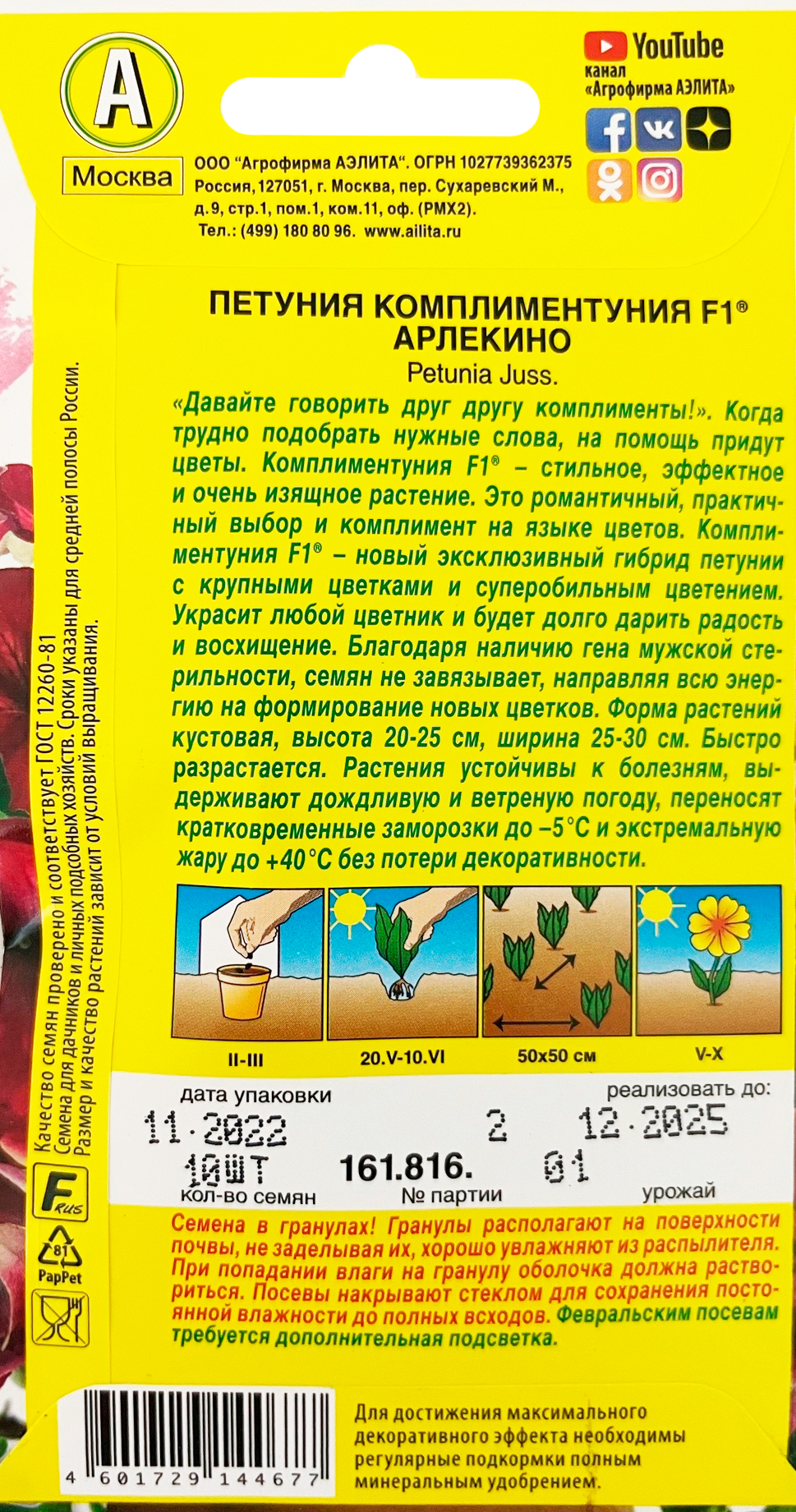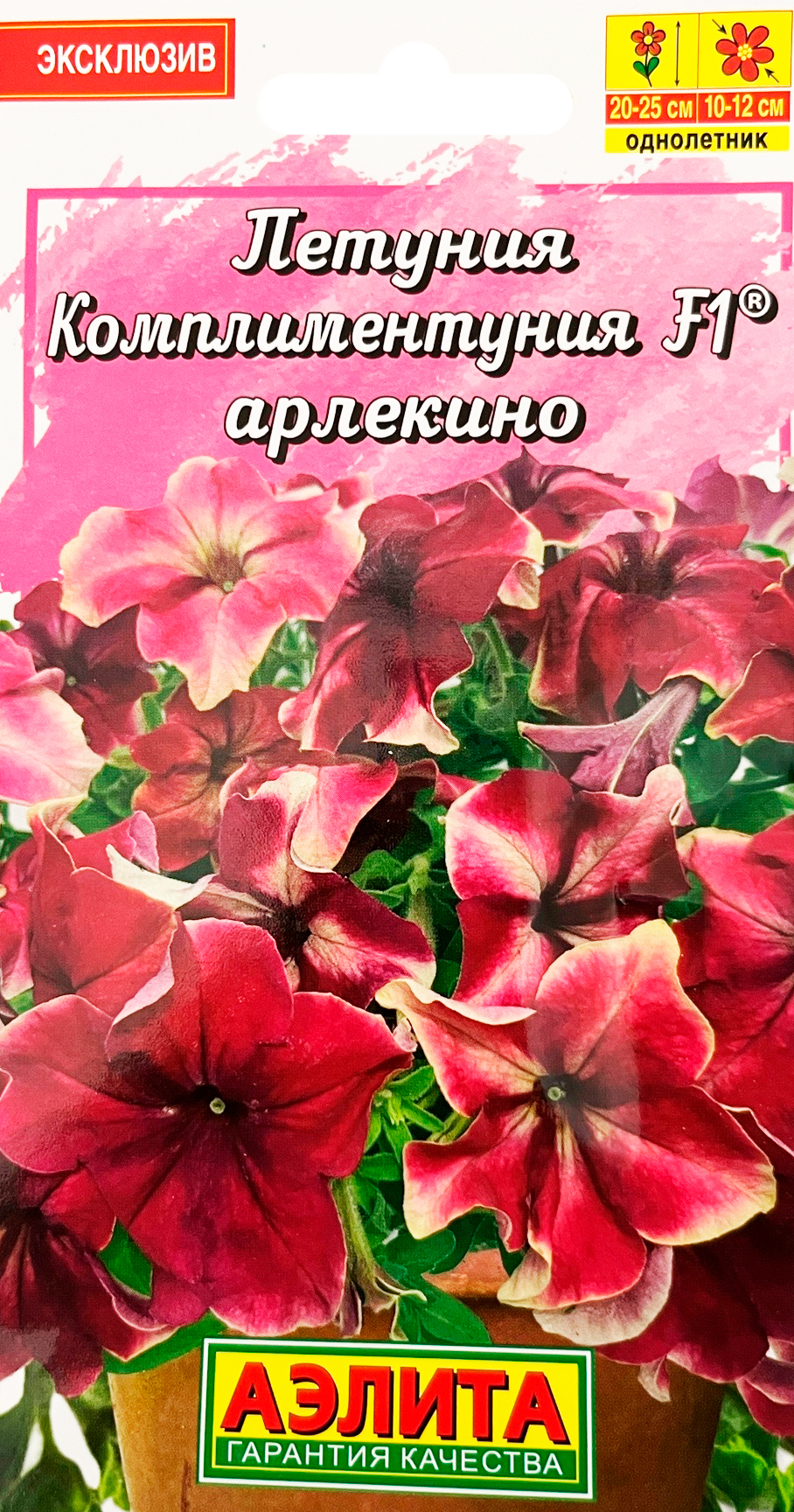 Петуния Комплиментуния F1 арлекино 10шт«Давайте говорить друг другу комплименты». Когда трудно подобрать нужные слова, на помощь придут цветы. Комплиментуния F1® – стильное, эффектное и очень изящное растение. Это романтичный, практичный выбор и комплимент на языке цветов. Комплиментуния F1® – эксклюзивный гибрид (новая петуния) с крупными цветками и суперобильным цветением. Украсит любой цветник и будет долго дарить радость и восхищение. Благодаря наличию гена мужской стерильности семян не завязывает, направляя всю энергию на формирование новых цветков. Форма растений кустовая, со склонностью к трейлингу: ширина больше высоты. Высота 20-25 см, ширина 25-30 см. Быстро разрастается. Растения устойчивы к болезням, выдерживают дождливую и ветреную погоду, переносят кратковременные заморозки до –5°С и экстремальную жару до +40°С без потери декоративности.