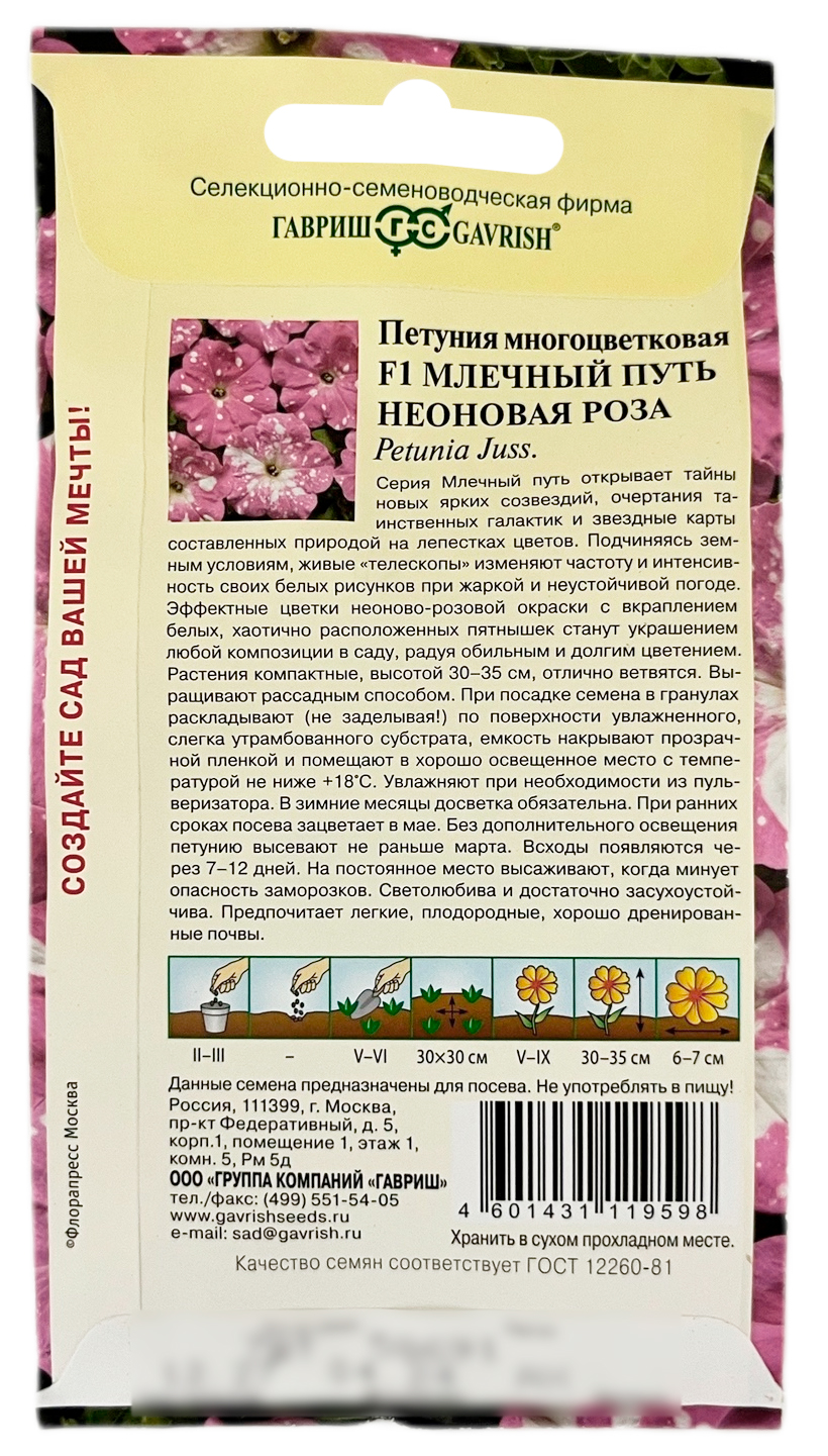 Петуния многоцветковая F1 МЛЕЧНЫЙ ПУТЬ НЕОНОВАЯ РОЗА ГАВРИШСерия Млечный путь открывает тайны новых ярких созвездий, очертания таинственных галактик и звездные карты составленных природой на лепестках цветов. Подчиняясь земным условиям, живые «телескопы» изменяют частоту и интенсивность своих белых рисунков при жаркой и неустойчивой погоде. Эффектные цветки неоново-розовой окраски с вкраплением белых, хаотично расположенных пятнышек станут украшением любой композиции в саду, радуя обильным и долгим цветением. Растения компактные, высотой 30-35 см, отлично ветвятся. Выращивают рассадным способом. При посадке семена в гранулах раскладывают (не заделывая!) по поверхности увлажненного, слегка утрамбованного субстрата, емкость накрывают прозрачной пленкой и помещают в хорошо освещенное место с температурой не ниже +180С. Увлажняют при необходимости из пульверизатора. В зимние месяцы досветка обязательна. При ранних сроках посева зацветает в мае. Без дополнительного освещения петунию высевают не раньше марта. Всходы появляются через 7-12 дней. На постоянное место высаживают, когда минует опасность заморозков. Светолюбива и достаточно засухоустойчива. Предпочитает легкие, плодородные, хорошо дренированные почвы.