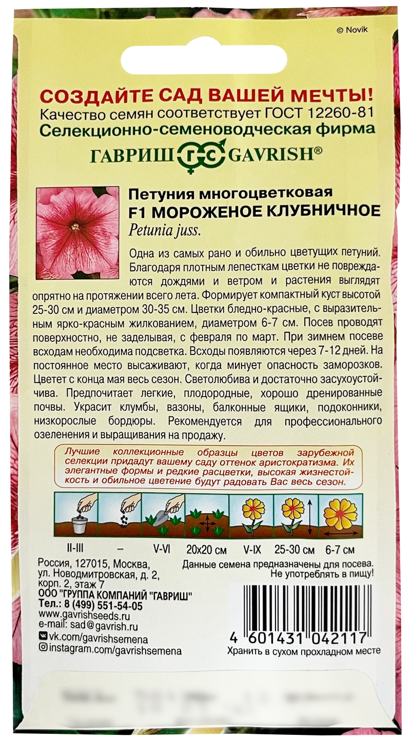 Петуния Мороженое клубничное F1 ГАВРИШОдна из самых рано и обильно цветущих петуний. Благодаря плотным лепесткам, цветки не повреждаются дождями и ветром и растения выглядят опрятно на протяжении всего лета. Формирует компактный куст высотой 25-30 см и диаметром 30-35 см. Цветки бледно-красные с выразительным ярко-красным жилкованием, диаметром 6-7 см. Посев проводят с февраля по март. При зимнем посеве всходам необходима подсветка. Всходы появляются через 7-12 дней. На постоянное место высаживают, когда минует опасность заморозков. Цветет с конца мая весь сезон. Светолюбива и достаточно засухоустойчива. Предпочитает легкие, плодородные, хорошо дренированные почвы. Украсит клумбы, вазоны, балконные ящики, подоконники, низкорослые бордюры. Рекомендуется для профессионального озеленения и выращивания на продажу.