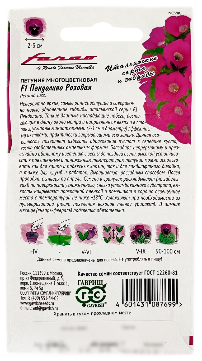 Петуния многоцветковая F1 ПЕНДОЛИНО РОЗОВАЯ ГАВРИШНевероятно яркие, самые раннецветущие и совершенно новые однолетние гибриды итальянской серии F1 Пендолино. Тонкие, длинные, ниспадающие побеги, достигающие в длину около метра и направленные вверх и в стороны, усыпаны миниатюрными (2-3 см в диаметре) эффектными цветками, практически закрывающими всю зелень. Данная особенность позволяет избегать образования пустот в середине куста, часто свойственных ампельным формам. Благодаря непрерывному и чрезвычайно обильному цветению с весны и до поздней осени, высокой устойчивости к повышенным и пониженным температурам, петунии можно использовать как для кашпо и подвесных корзин, так и для ландшафтного дизайна, а также для клумб и рабаток. Выращивают рассадным способом. Посев проводят с января по апрель поверхностно, под стекло (после появления всходов стекло убирают). В зимние месяцы (январь-февраль) подсветка обязательна. Светолюбива и достаточно засухоустойчива. Предпочитает легкие, плодородные, хорошо дренированные почвы.