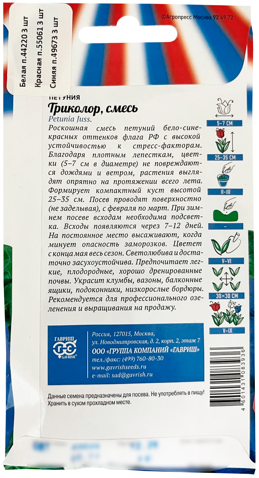 Петуния смесь Триколор ГАВРИШСмесь многоцветковых петуний формируют поразительно мощный каскад из зелени и огромного количества цветов в оттенках национального флага. Одно растение обладает такой скоростью и силой роста, что быстро заполнит пространство диаметром 1 м. Цветение настолько обильное, что практически не видно зелени и количество цветков не меняется с начала цветения до заморозков. Габитус растения зависит от плотности посадки. При высадке на расстоянии 30 см растут в основном, вверх, образуя «подушку» из цветков высотой 20 см. Крепкие стебли позволяют поддерживать форму в течение всего сезона. Высаженные на расстоянии 60 см, разрастаются как почвопокровные во всех направлениях на площади 1 м². Но эффектнее всего выглядят растения в подвесных корзинах и балконных ящиках, где мощные многочисленные побеги длиной 80-100 см, свисая, образуют грандиозный цветущий водопад. Выращивают рассадным способом. Посев проводят с января по апрель, поверхностно, под стекло (после появления всходов стекло убирают). В зимние месяцы (январь-февраль) досветка обязательна. На постоянное место высаживают, когда минует опасность заморозков. Светолюбива и достаточно засухоустойчива. Предпочитает легкие, плодородные, хорошо дренированные почвы.