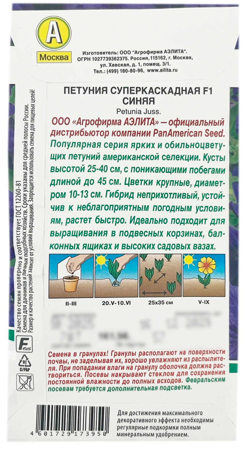 Петуния суперкаскадная F1 СИНЯЯ АЭЛИТАПопулярная серия ярких и обильноцветущих петуний американской селекции. Кусты высотой 25-40 см, с поникающими побегами длиной до 45 см. Цветки крупные, диаметром 10-13 см. Гибрид неприхотливый, устойчив к неблагоприятным погодным условиям, растет быстро. Идеально подходит для выращивания в подвесных корзинах, балконных ящиках и высоких садовых вазах.