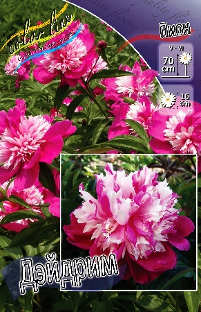 Относится к группе молочноцветковых, травянистых. Цветки Малиново-белые с полосками, махровые, диаметром 14 см. Зацветает в мае - июне, цветение обильное. Имеет легкий аромат. Листья тёмно-зелёные, с красным оттенком. Высота растения 80-90 см. Период посадки растения со второй половины августа до начала октября. Глубина посадочной ямы составляет 50-60 см, при этом корневище углубляется так, чтобы расстояние от верхней почки до поверхности земли составляло не более 3-5 см. Место для посадки - солнечные, безветренные места. В тени пион хорошо развивается, но не цветет. Пион Дэйдрим засухо- и морозоустойчив. Пион требует плодородной, дренированной почвы. Не подвергается воздействию серой гнили. Дэйдрим - сорт, победивший время. Яркий, пылкий и неповторимый - другого такого нет!Характеристики
