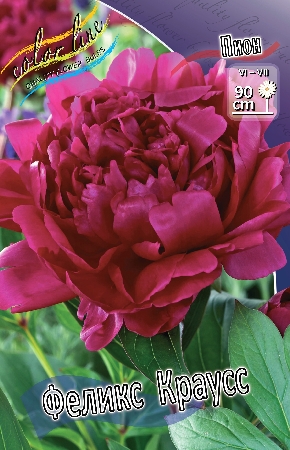 Пион Феликс Краусс - относится к группе молочноцветковых, травянистых. Цветки: темно-красные с синим оттенком, махровые, диаметром 17 см. Зацветает в мае - июне, цветение обильное. Имеет легкий аромат. Листья тёмно-зелёные. Высота растения 90 см. Период посадки растения со второй половины августа до начала октября. Глубина посадочной ямы составляет 50-60 см, при этом корневище углубляется так, чтобы расстояние от верхней почки до поверхности земли составляло не более 3-5 см. Место для посадки - солнечные, безветренные места. В тени пион хорошо развивается, но не цветет. Пион Феликс Краусс засухо- и морозоустойчив. Пион требует плодородной, дренированной почвы. Не подвергается воздействию серой гнили.Характеристики