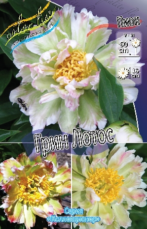Пион Грин Лотос полумахровый-кактусовидный. Цветок диаметром 16 см, похож на кактусовидный георгин. Лепестки хорошей текстуры, белые с бледно-зелёными полосами и нежно-розовыми краями. В центре контрастные жёлтые тычинки. Аромат лёгкий, приятный. Цветки разные по окраске. Листья красивые, тёмно-зелёные, блестящие. Куст компактный, высотой 50-60 см, хорошо переносит жару. Цветение обильное, в ранние сроки. Прекрасно подходит для срезки.Больше информации на www.podvorje.ru