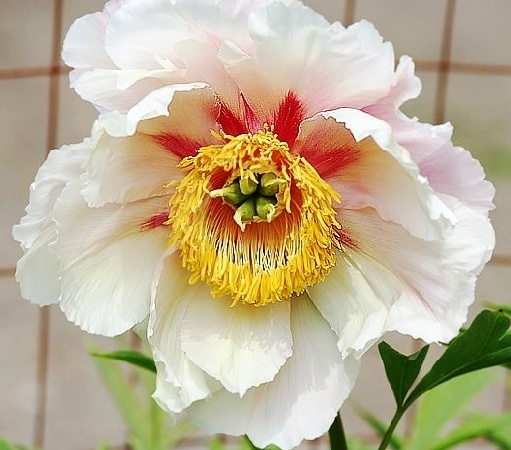 Цветок простой, очень большой, диаметром 22-25 см, белый, оттенённый жёлтым и нежно-зелёным. Язычок у основания лепестка желтовато-красный. Тычиночные нити золотистого цвета, у основания — пурпурные. Аромат лёгкий. Пышная, очень красивая листва. Куст очень сильный, высокий и широкий. Исключительный сорт!
