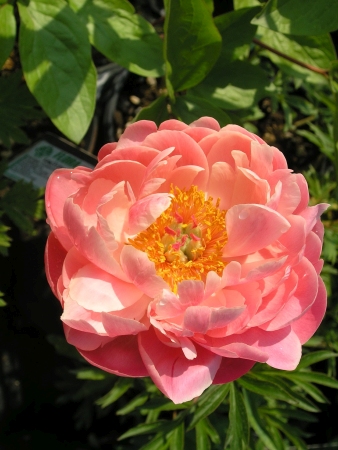 Пион Корал Н Голд гибрид, простая форма цветка.Цветок нежного, сияющего кораллового цвета .