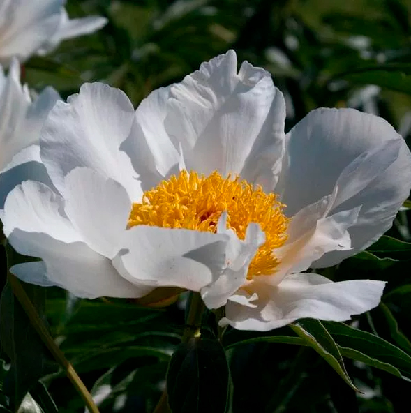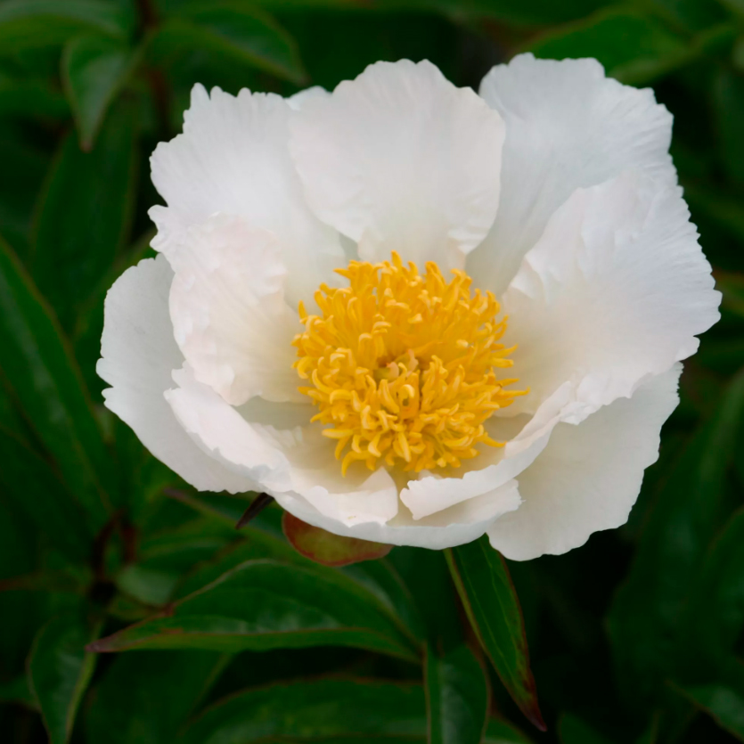 Пион Кринклед УайтОдин из лучших сортов с белыми не махровыми цветками. Очаровательные цветки с еле уловимым ароматом! Крупные лепестки словно вырезаны из полупрозрачной рисовой бумаги. Многочисленные цветки с высоким центром из желтых тычинок раскрываются нежно-розовыми, но розовый оттенок быстро исчезает. Белоснежные и легкие цветки-бабочки надежно удерживают тонкие, но прочные цветоносы. Элегантный куст не разваливается после дождя. Универсальный обильноцветущий сорт для сада и срезки.
