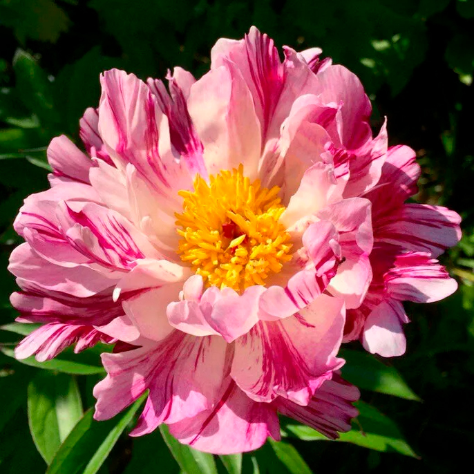 Пион Пинк Луау (1шт)Полумахровый. Цветок диаметром 14 см, розовый с малиновыми полосами и центром из жёлтых тычинок. Пестики с малиновыми рыльцами. Бутоны с малиновыми прожилками. Стебли прочные. Листва хорошая. Высота 75-80 см.