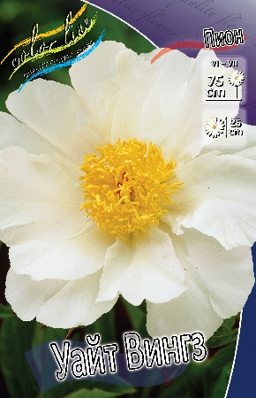 Пион Уайт. Вид: молочноцветковый. Высота растения: до 90 см. Цветок простой, очень крупный (до 30 см.), белый, с рифлёными лепестками и желтыми тычинками, зимостойкость хорошая.Характеристики