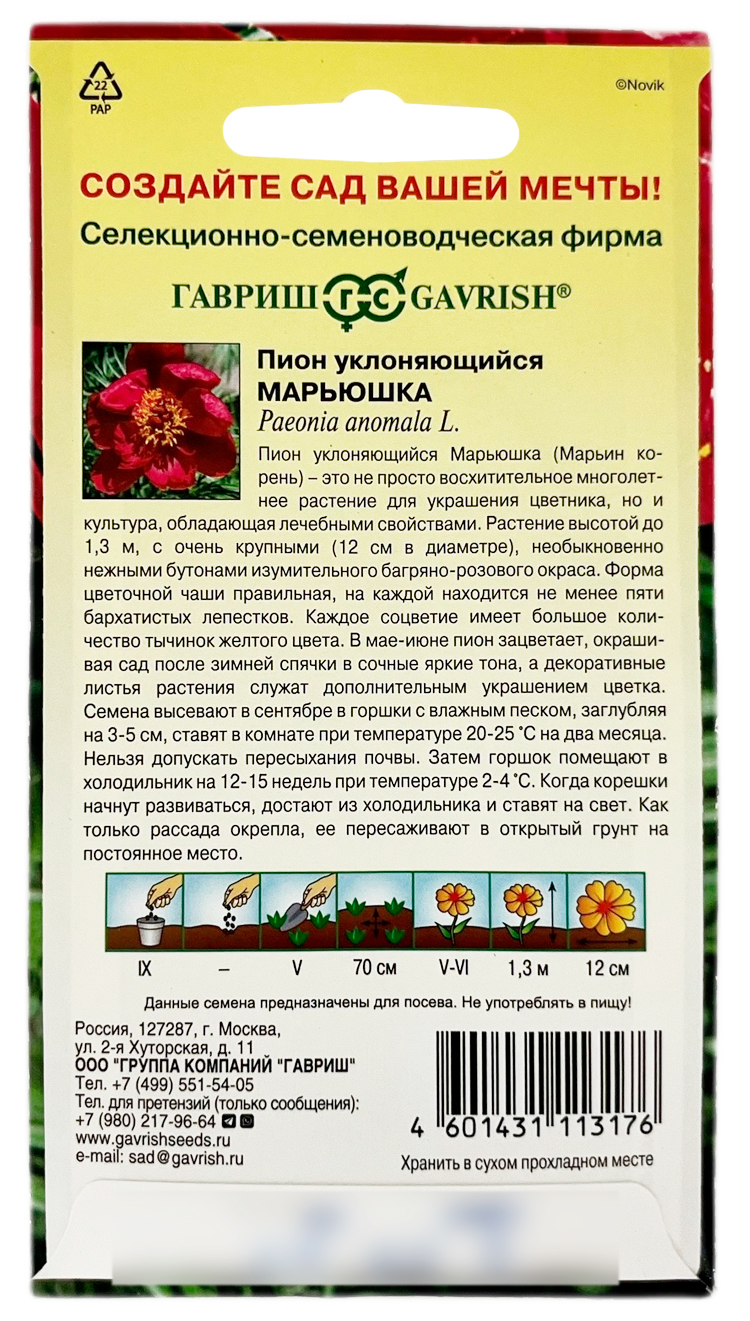 Пион уклоняющийся МАРЬЮШКА ГАВРИШПион уклоняющийся Марьюшка (Марьин корень) не просто восхитительное многолетнее растение для украшения цветника, а и культура, обладающая лечебными свойствами. Растение высотой до 1,3 м с очень крупными (12 см в диаметре), необыкновенно нежными бутонами изумительного багряно-розового окраса. Форма цветочной чаши правильная, на каждой находится не менее пяти бархатистых лепестков. Каждое соцветие имеет большое количество тычинок желтого цвета. В мае-июне пион зацветает, окрашивая сад после зимней спячки в сочные, яркие тона, а декоративные листья растения служат дополнительным украшением цветка. Семена высевают в сентябре, в горшки с влажным песком, заглубляя на 3-5 см, ставят в комнате при температуре 20-25оС на два месяца. Нельзя допускать пересыхание почвы. Затем горшок помещают в холодильник на 12-15 недель при температуре 2-4оС. Когда корешки начнут развиваться, достают из холодильника и ставят на свет. Как только рассада окрепла, ее пересаживают в открытый грунт на постоянное место.