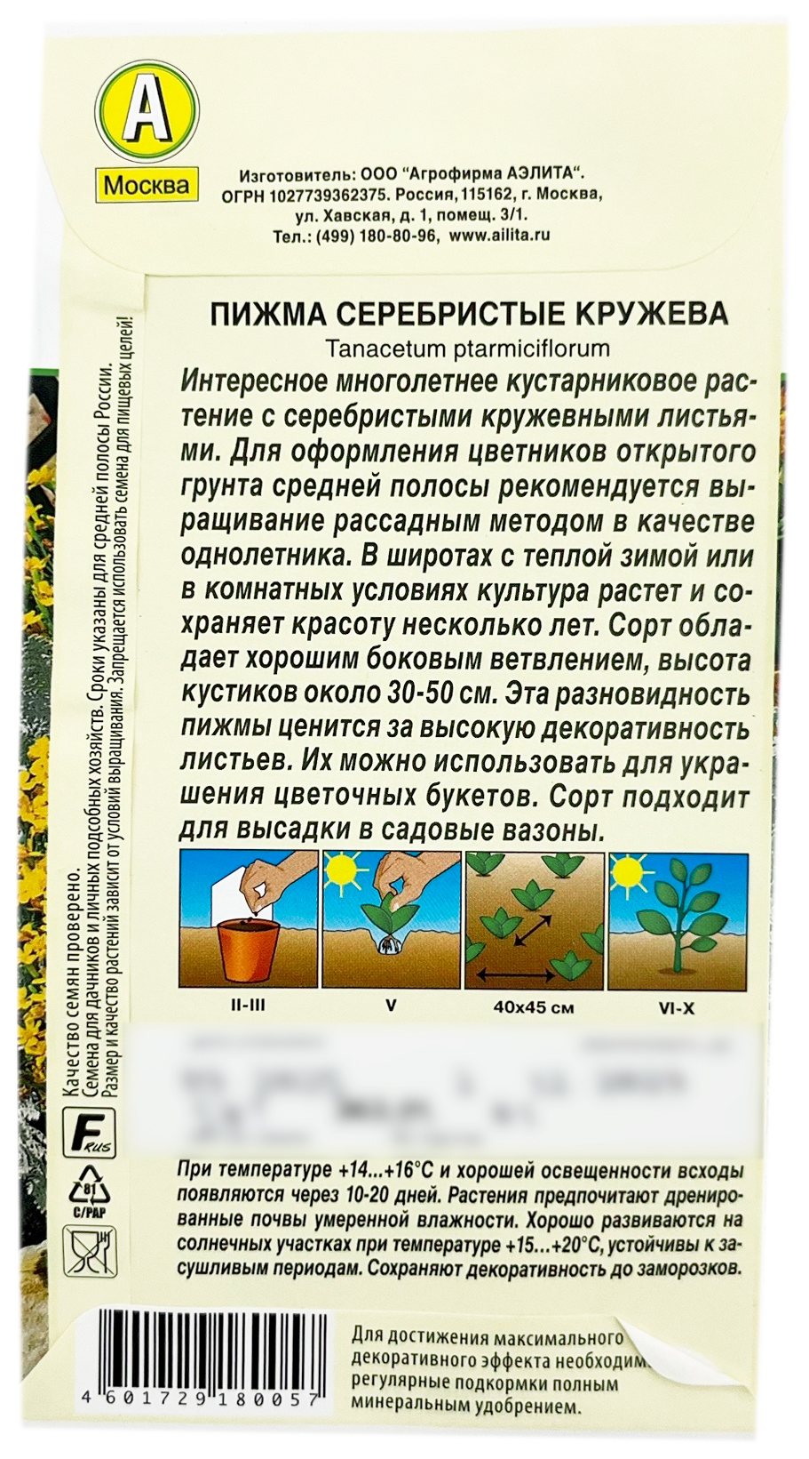 Пижма СЕРЕБРИСТЫЕ КРУЖЕВА АЭЛИТАИнтересное многолетнее кустарниковое растение с серебристыми кружевными листьями. Для оформления цветников открытого грунта средней полосы рекомендуется выращивание рассадным методом в качестве однолетника. В широтах с теплой зимой или в комнатных условиях культура растет и сохраняет красоту несколько лет. Сорт обладает хорошим боковым ветвлением, высота кустиков около 30-50 см. Эта разновидность пижмы ценится за высокую декоративность листьев. Их можно использовать для украшения цветочных букетов. Сорт подходит для высадки в садовые вазоны.