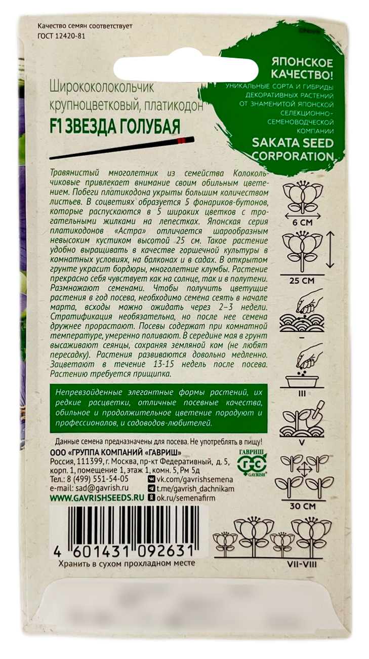 Ширококолокольчик крупноцветковый платикодон ЗВЕЗДА ГОЛУБАЯ ГАВРИШТравянистый многолетник из семейства Колокольчиковые привлекает внимание своим обильным цветением. Побеги платикодона укрыты большим количеством листьев. В соцветиях образуются 5 фонариков-бутонов, которые распускаются в 5 широких цветков с трогательными жилками на лепестках. Японская серия платикодонов «Астра» отличается шарообразным невысоким кустиком высотой 25 см. Такое растение удобно выращивать в качестве горшечной культуры в комнатных условиях, на балконах и в садах. В открытом грунте украсит бордюры, многолетние клумбы. Растение прекрасно себя чувствует как на солнце, так и в полутени. Размножают семенами. Чтобы получить цветущие растения в год посева необходимо семена сеять в начале марта, всходы можно ожидать через 2–3 недели. Стратификация необязательна, но после нее семена дружнее прорастают. Посевы содержат при комнатной температуре, умеренно поливают. В конце мая-начале июня в грунт высаживают сеянцы, сохраняя земляной ком (не любят пересадку). Растения развиваются довольно медленно.