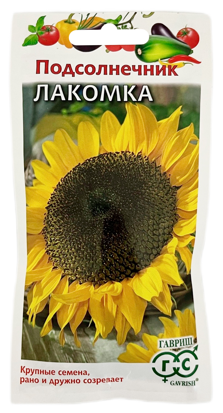 Подсолнечник ЛакомкаСкороспелый (от всходов до уборки 65-71 день) высокоурожайный лущильный сорт. Корзинка с семенами большая, повернута вниз. Семена крупные овально-удлиненной формы, черные с серой полосой по краю, хорошо выполненные. Выращивают прямым посевом семян в открытый грунт на глубину 1,5-2 см. Сорт ценится за высокий уровень устойчивости к ложной мучнистой росе и подсолнечной моли. Отличается дружным цветением, созреванием и выравненностью растений по высоте. Хороший медонос. Очищенные семена подсолнечника добавляют в салаты и кондитерские изделия, используют как панировку для котлет.