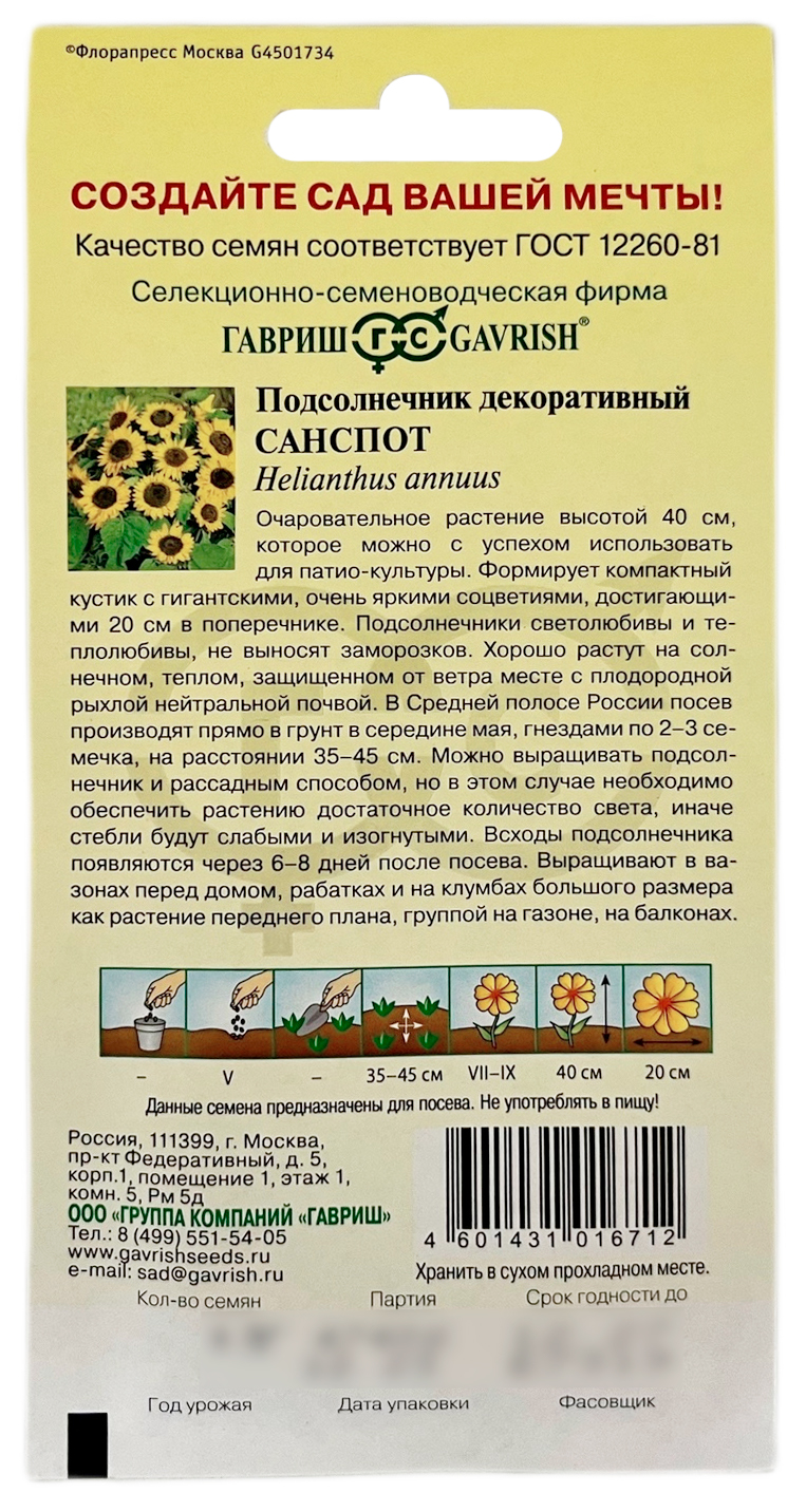 Подсолнечник декоративный САНСПОТ ГАВРИШНевысокое растение, высота которого не привышает 40 см, можно с успехом использовать для патио-культуры. Формирует компактный кустик с гигантскими для такого растения, очень яркими соцветиями, достигающими 20 см в поперечнике. Посолнечники светолюбивы и теплолюбивы и не выносят заморозков. Хорошо растут на солнечном, теплом, защищенном от ветра месте с плодородной, рыхлой и нейтральной почвой. В Средней России посев производят прямо в грунт в середине мая, гнездами по 2-3 семени, на расстоянии 35-45 см. Можно выращивать подсолнечник и рассадным способом, но в этом случае необходимо обеспечить растению достаточное количество света, иначе стебли будут слабыми и изогнутыми. Всходы подсолнечника появляются через 6-8 дней после посева. Выращивают в вазонах перед домом, на рабатках и клумбах большого размера как растения переднего плана, группой на газоне, на балконах.