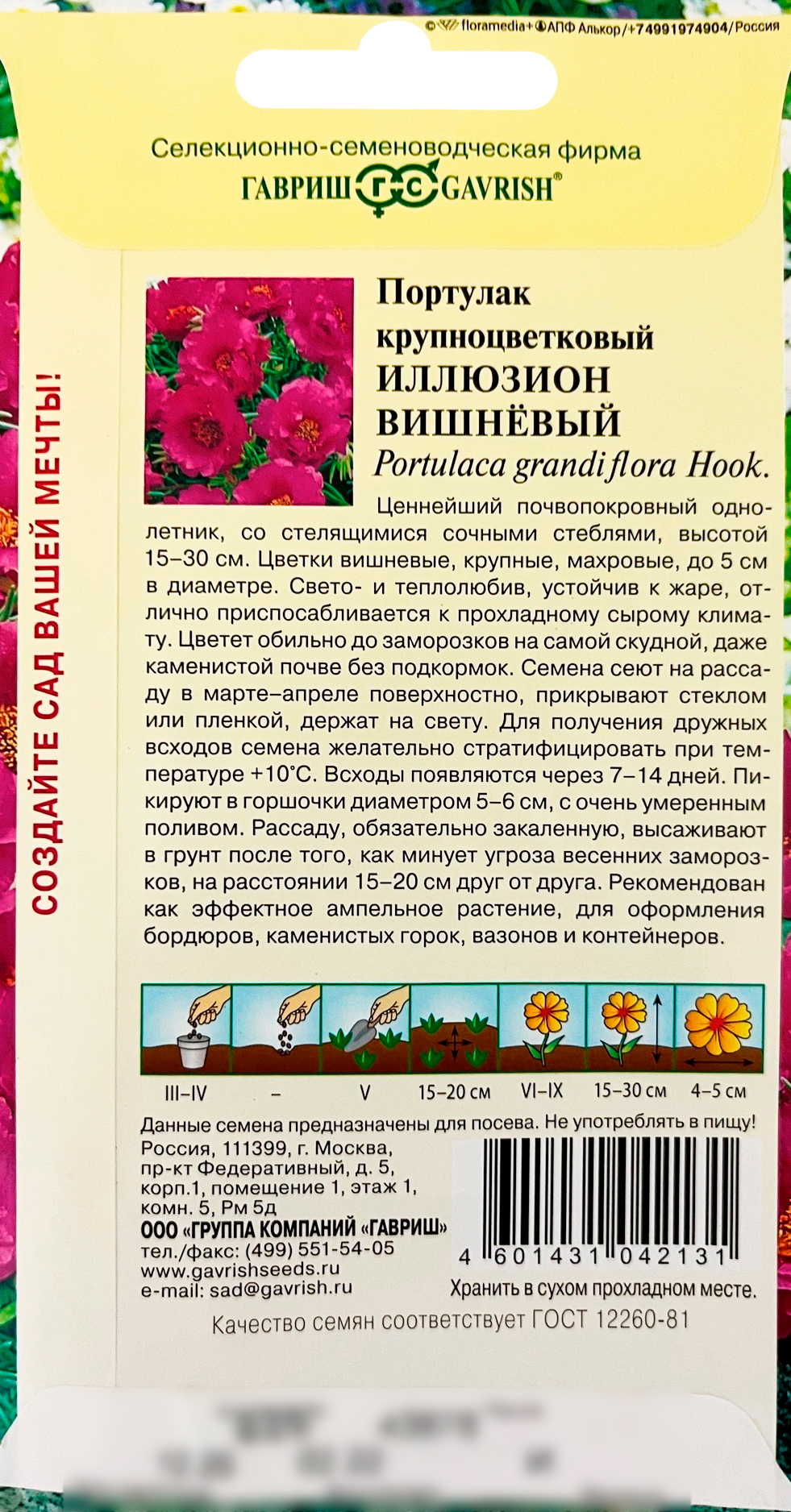 Портулак Иллюзион вишневый ГАВРИШЦеннейший почвопокровный однолетник, со стелящимися сочными стеблями, высотой 15-30 см. Цветки вишневые, крупные, махровые, до 5 см в диаметре. Свето- и теплолюбив, устойчив к жаре и засухе, отлично приспосабливается к прохладному сырому климату. Цветет обильно до заморозков на самой скудной, даже каменистой почве без подкормок. Семена сеют на рассаду в марте-апреле поверхностно, прикрывают стеклом или пленкой, держат на свету. Всходы появляются через 7-14 дней. Пикируют в горшочки диаметром 5-6 см, с очень умеренным поливом. Рассаду, обязательно закаленную, высаживают в грунт после того, как минует угроза весенних заморозков, на расстоянии 15-20 см друг от друга. Рекомендован как эффектное ампельное растение, для оформления бордюров, каменистых горок, вазонов и контейнеров.