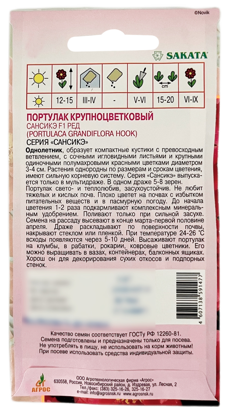 Портулак Сансикэ Ред F1 АГРОСОднолетник, образует компактные кустики с превосходным ветвлением, с сочными игловидными листьями и крупными одиночными полумахровыми красными цветками, диаметром 3-4 см. Растения однородны по размерам и срокам цветения, имеют сильную корневую систему. Серия «Сансикэ» выпускается только в мультидраже. В одном драже 5-8 зерен. Портулак светолюбив, теплолюбив и засухоустойчив. Не любит тяжелых и кислых почв. Плохо цветет на почвах с избытком питательных веществ и в пасмурную погоду. До начала цветения 1-2 раза подкармливают комплексным минеральным удобрением. Поливают только при сильной засухе. Семена на рассаду высевают в конце марта-первой половине апреля. Драже раскладывают по поверхности почвы, накрывают стеклом или пленкой. При температуре 24-26°С всходы появляются через 5-10 дней. Высаживают портулак на клумбы, рабатки, рокарии, ковровые цветники. Его можно выращивать в вазах, контейнерах, балконных ящиках. Хорош он для декорирования сухих откосов и подпорных стенок.