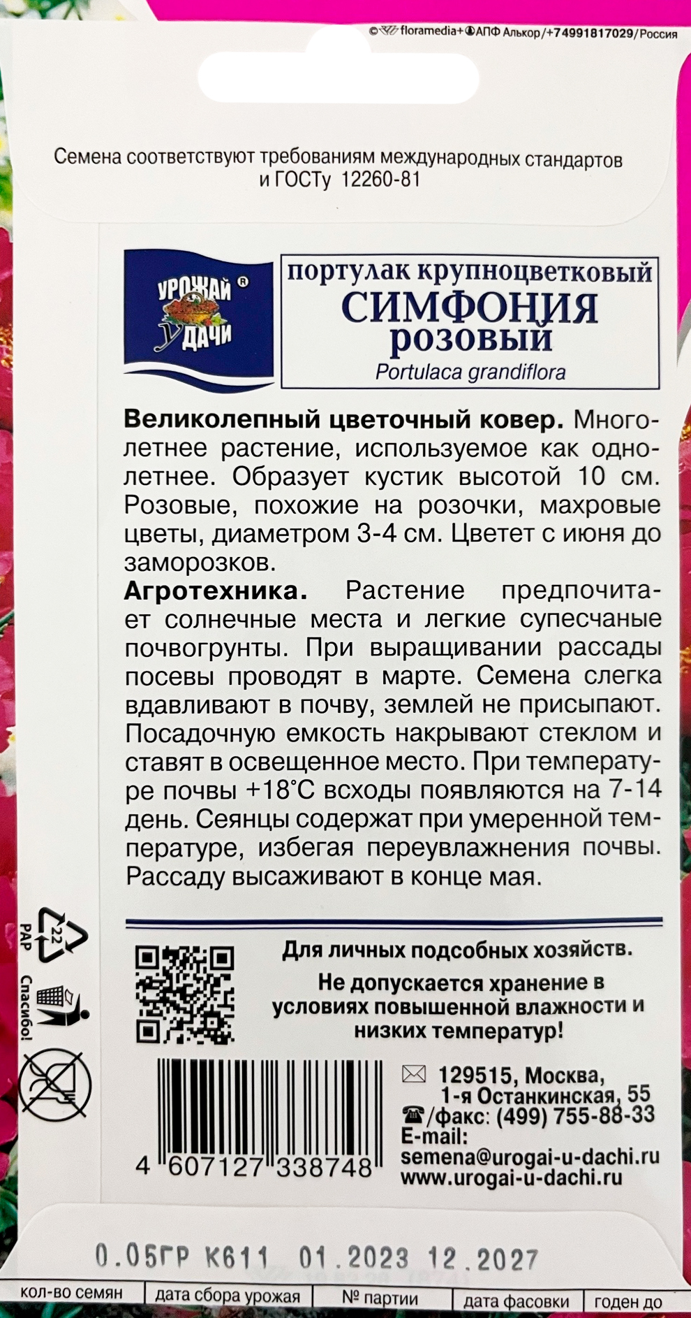 Портулак Симфония розовый 0,05гВеликолепный цветочный ковер. Многолетнее растение, используемое как однолетнее. Образует кустик высотой 10 см. Розовые, похожие на розочки, махровые цветы, диаметром 3-4 см. Цветет с июня до заморозков.