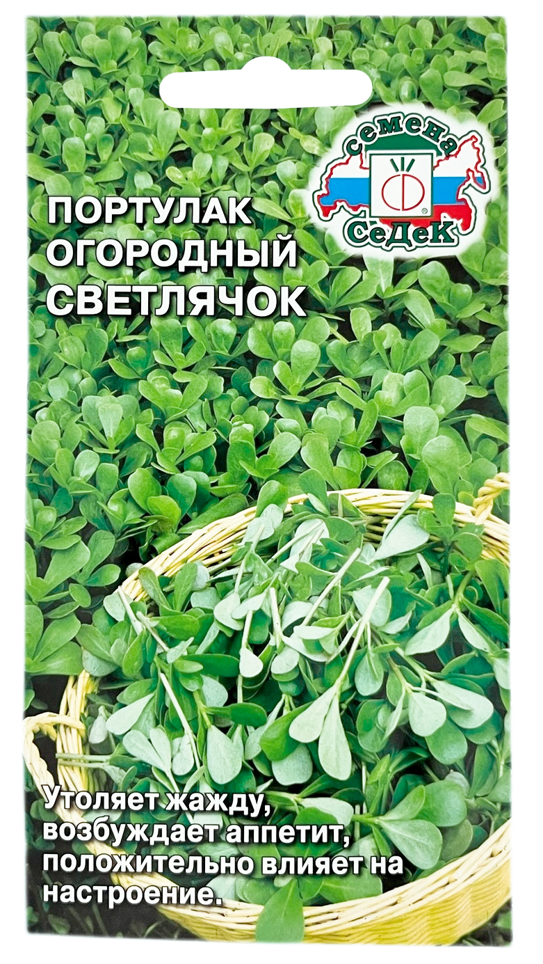 Портулак огородный Светлячок СеДеКОднолетнее травянистое суккулентное растение. Период от всходов до хозяйственной годности 25-30 дней. Стебель стелющийся, до 50 см высотой, листья мясистые, сочные. Цветки мелкие, желтые, собраны в соцветия. Обладает слабопряным, терпким и освежающим вкусом. Урожайность зеленой массы 2-2,5 кг/м². Ценность растения: содержит белки, сахара, микро и макроэлементы, витамин А и С. В народной медицине применяется при заболевании почек, печени, мочевого пузыря, снижает уровень холестерина и сахара в крови. Уборку производят до цветения. Употребляют молодые листья и стебли в свежем, отварном, маринованном виде.