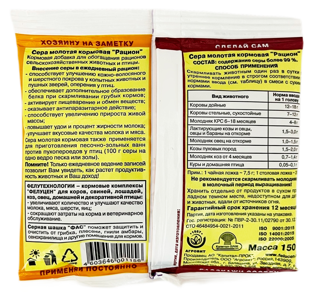Сера кормовая Рацион 150гСера кормовая натуральная высокой очистки используется для коров и молодняка КРС, коз, овец, кошек, собак и птиц, как один из основных компонентов кормовых и лечебных смесей. Кормовая добавка по внешнему виду представляет собой порошок с различными оттенками желтого цвета. Сера – это незаменимый белковый компонент, который обеспечивает качественные обменные процессы и участвует в построении клеточной структуры организма. Сера принимает участие в окислительно-восстановительных реакциях, обеспечивает полноценный процесс тканевого дыхания, способствует выработке дополнительной энергии, обеспечивает свертываемость крови, синтезирует коллаген и кератин, увеличивает образование антител, связывает тяжелые металлы и выводит их из организма, способствует:
